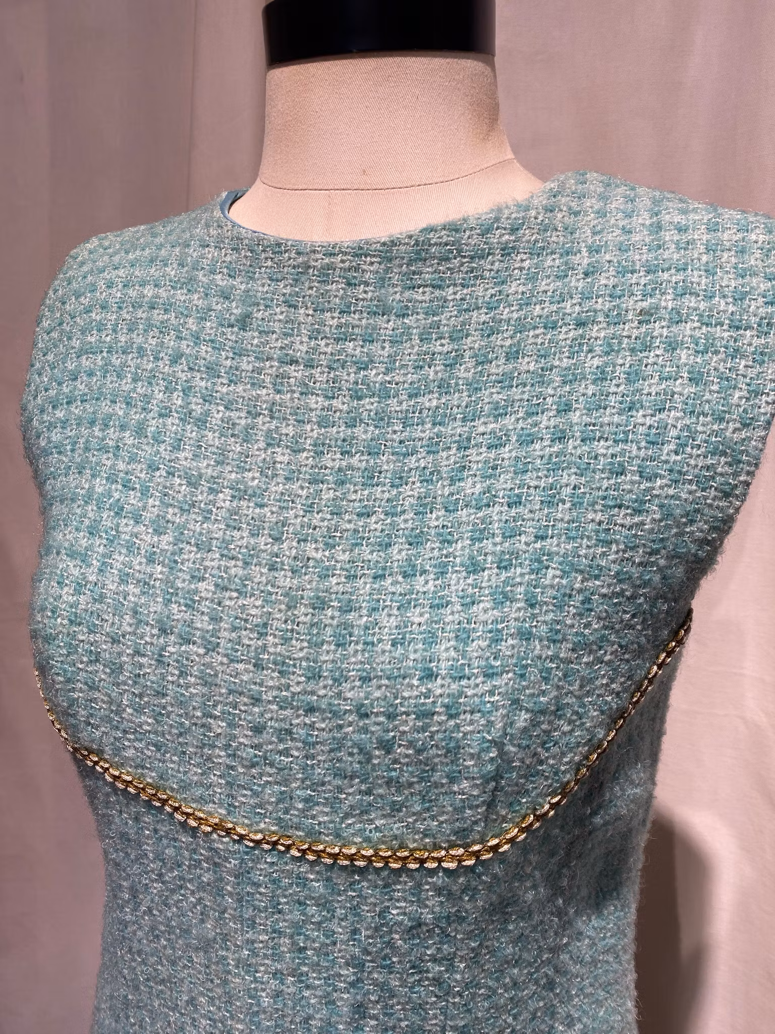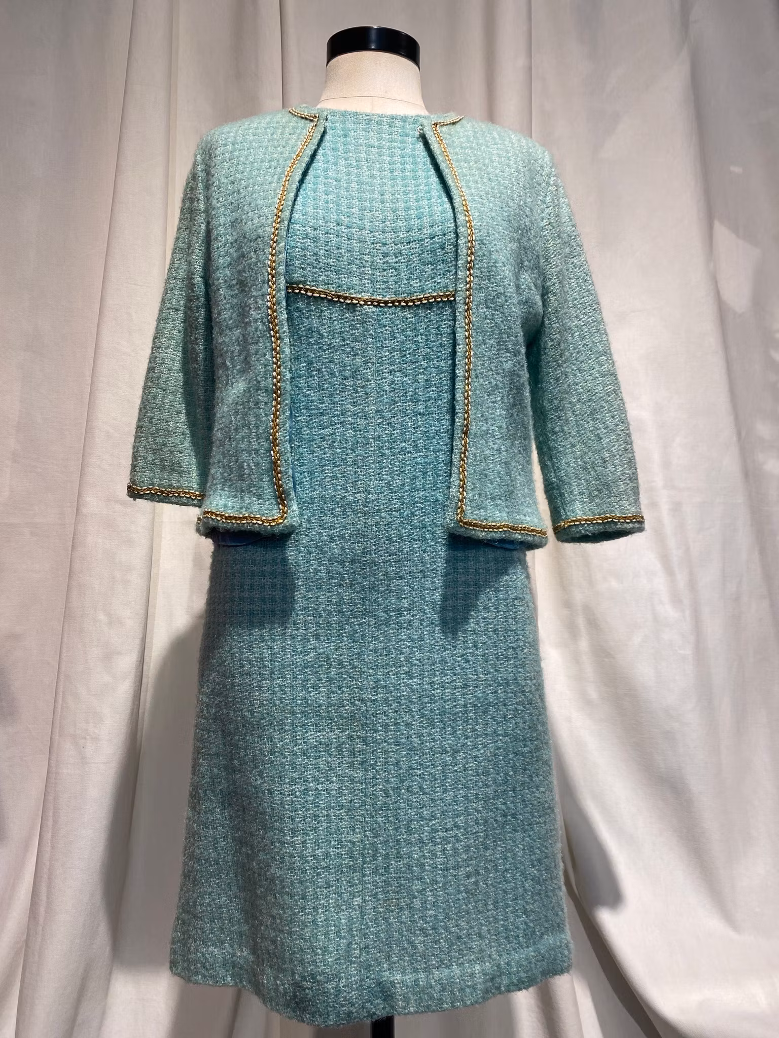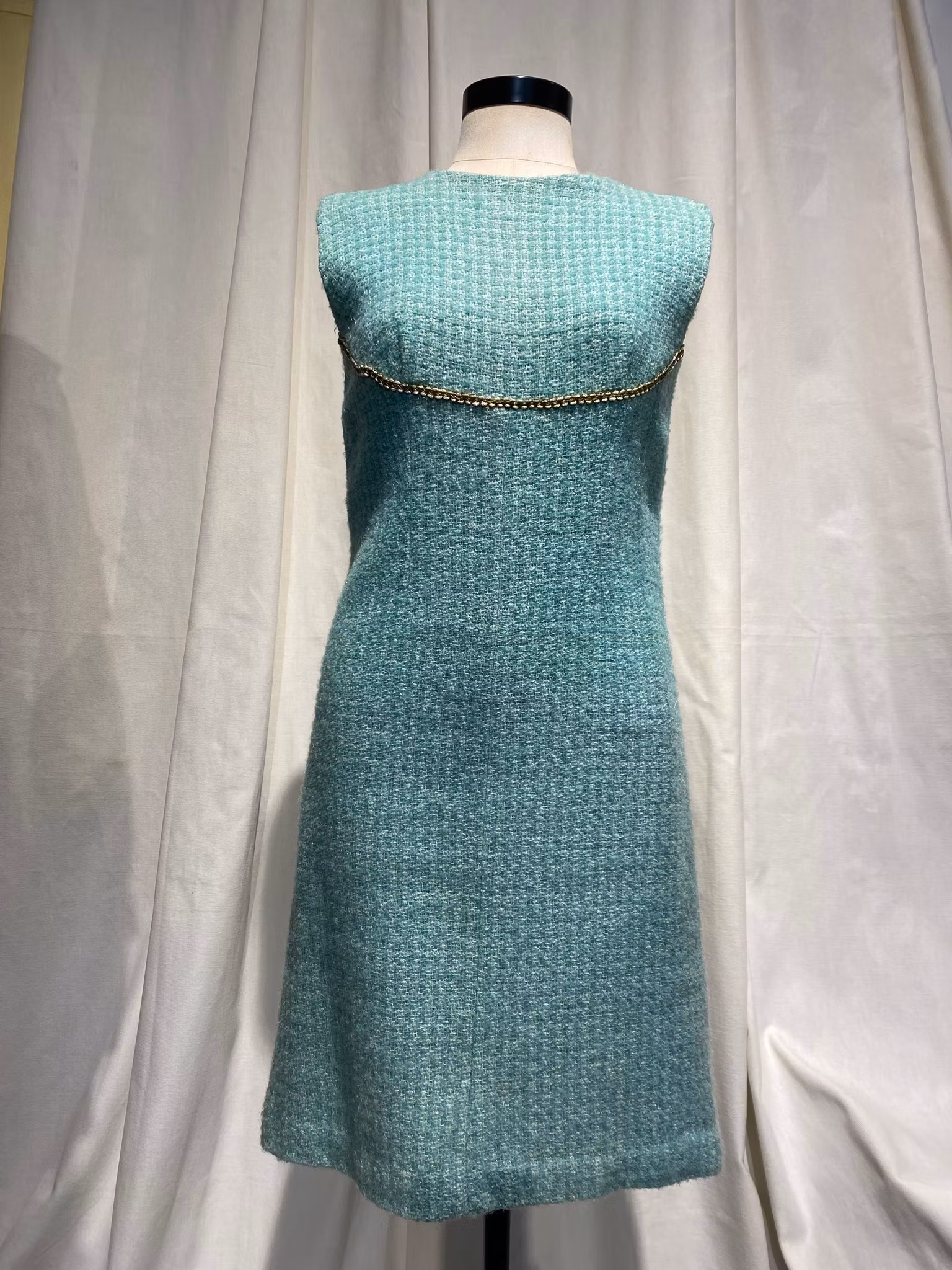 Turkose/grön fodrat ylle klänning, dragkedja i ryggen, fina detaljer som guld band under brösten. Det finns tillhörande kort jacka.