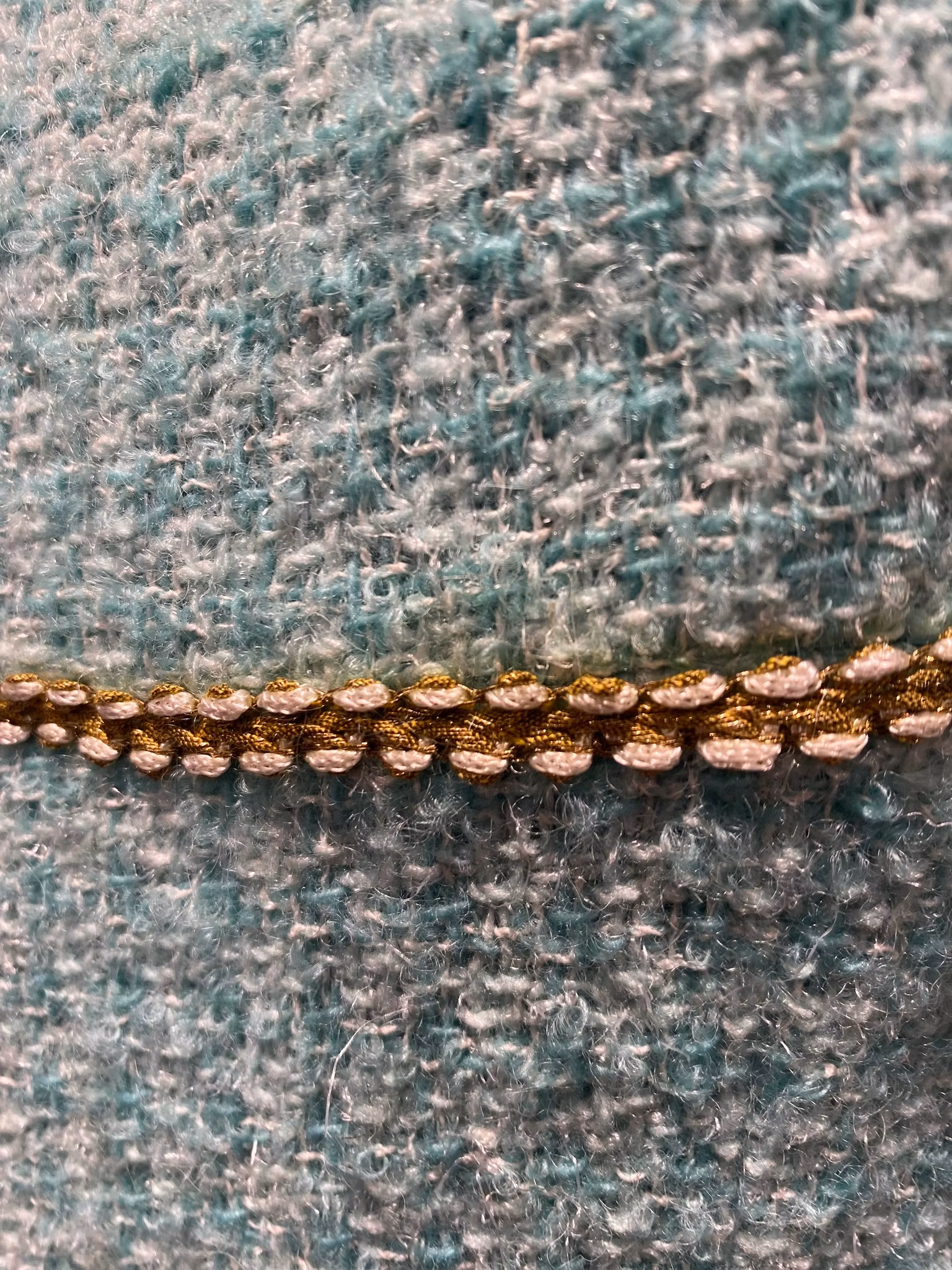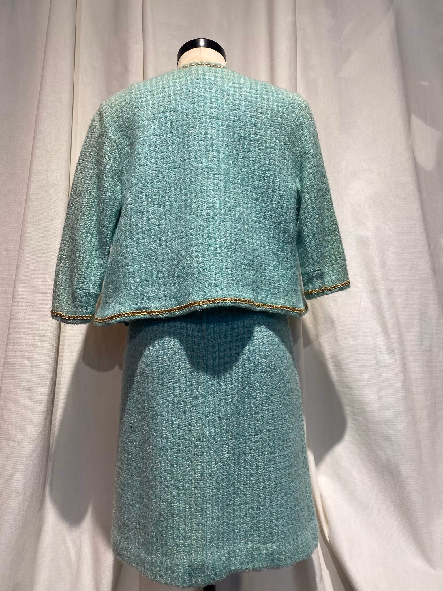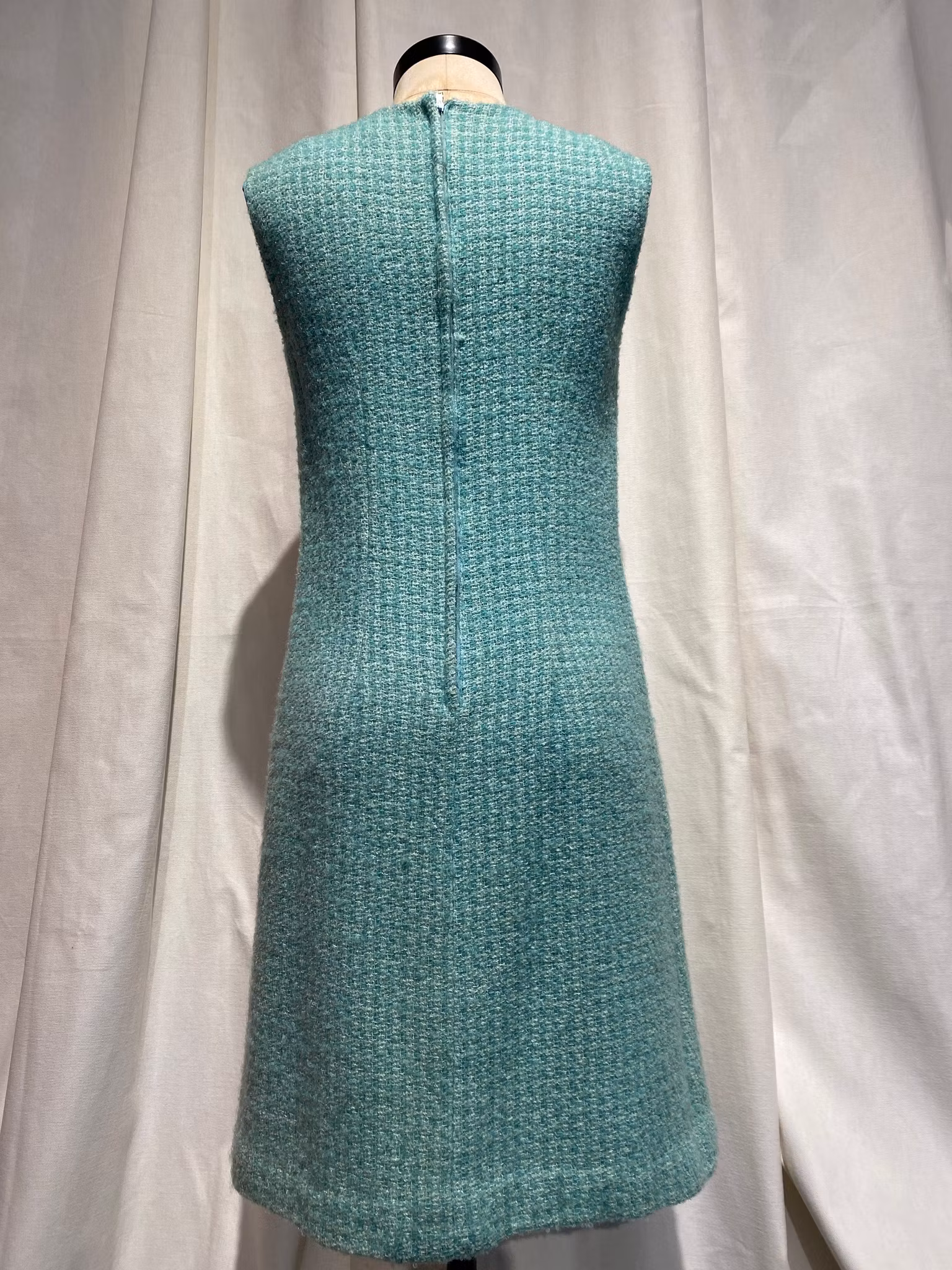 Turkose/grön fodrat ylle klänning, dragkedja i ryggen, fina detaljer som guld band under brösten. Det finns tillhörande kort jacka.