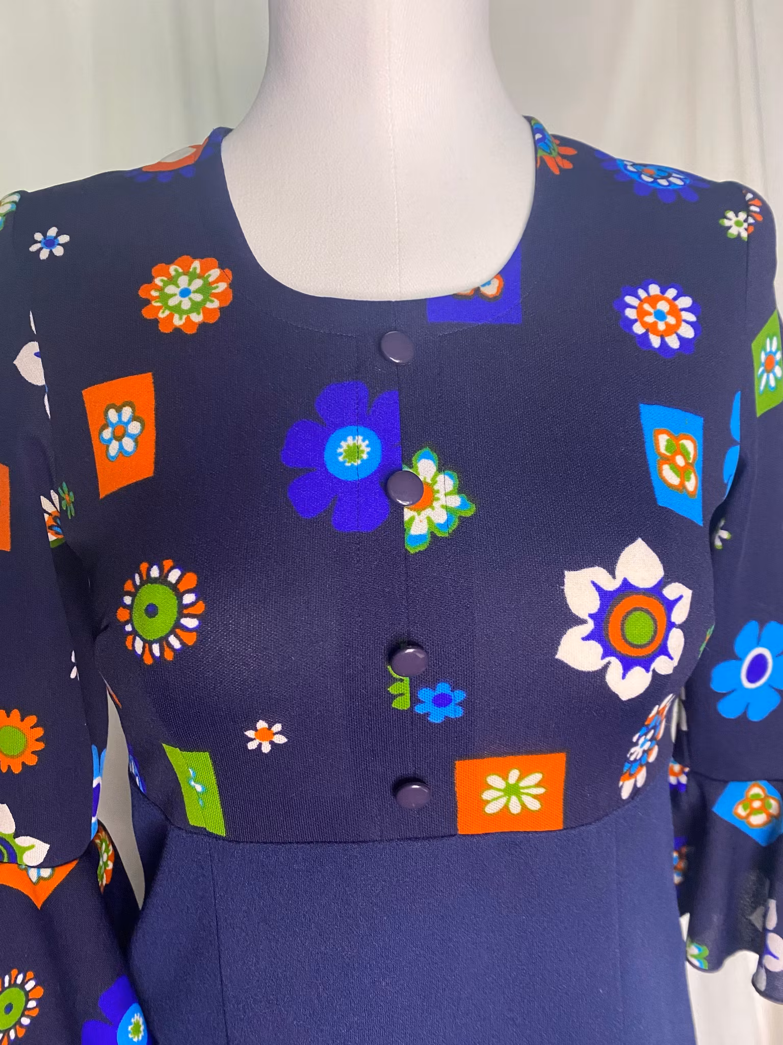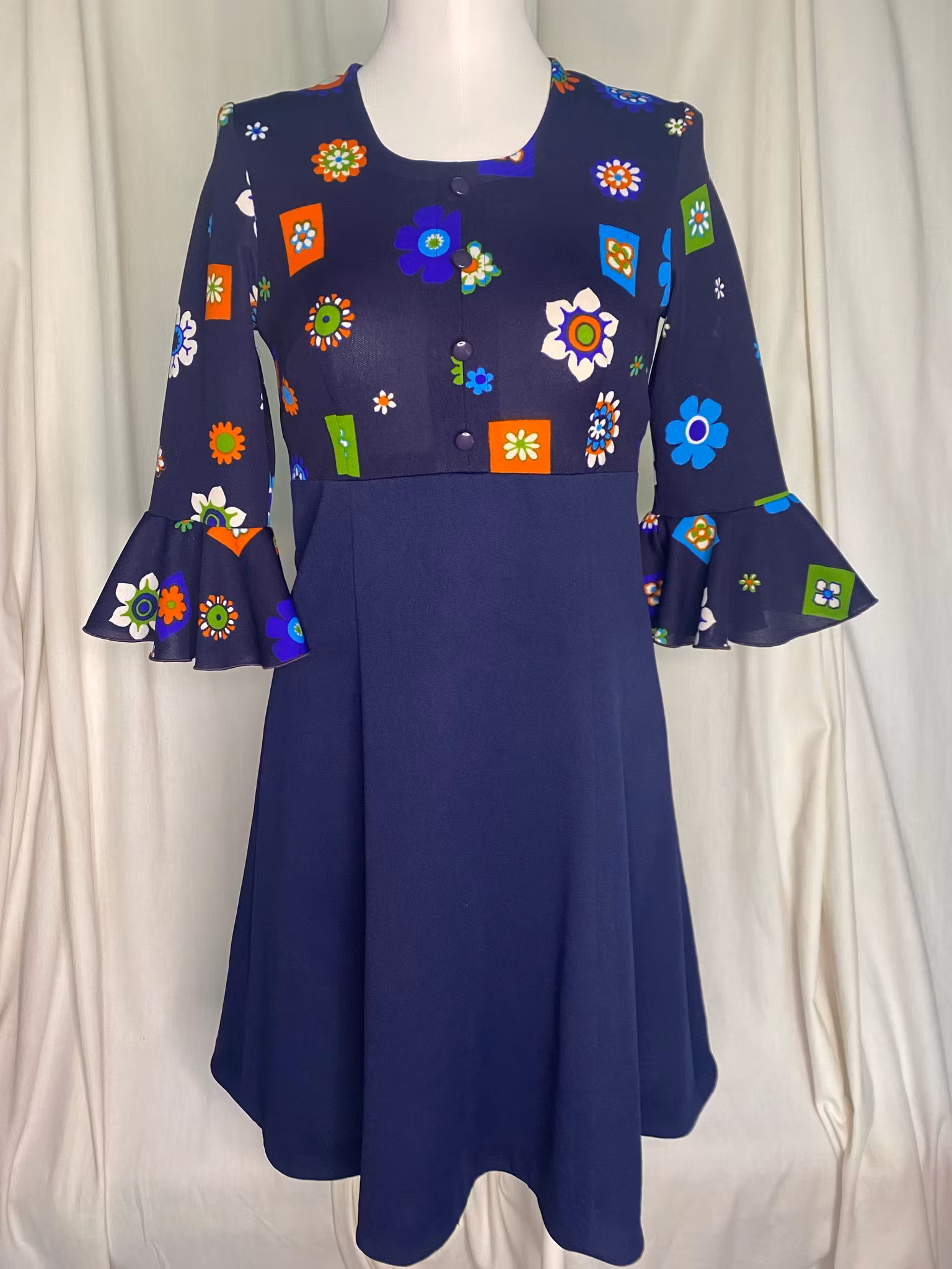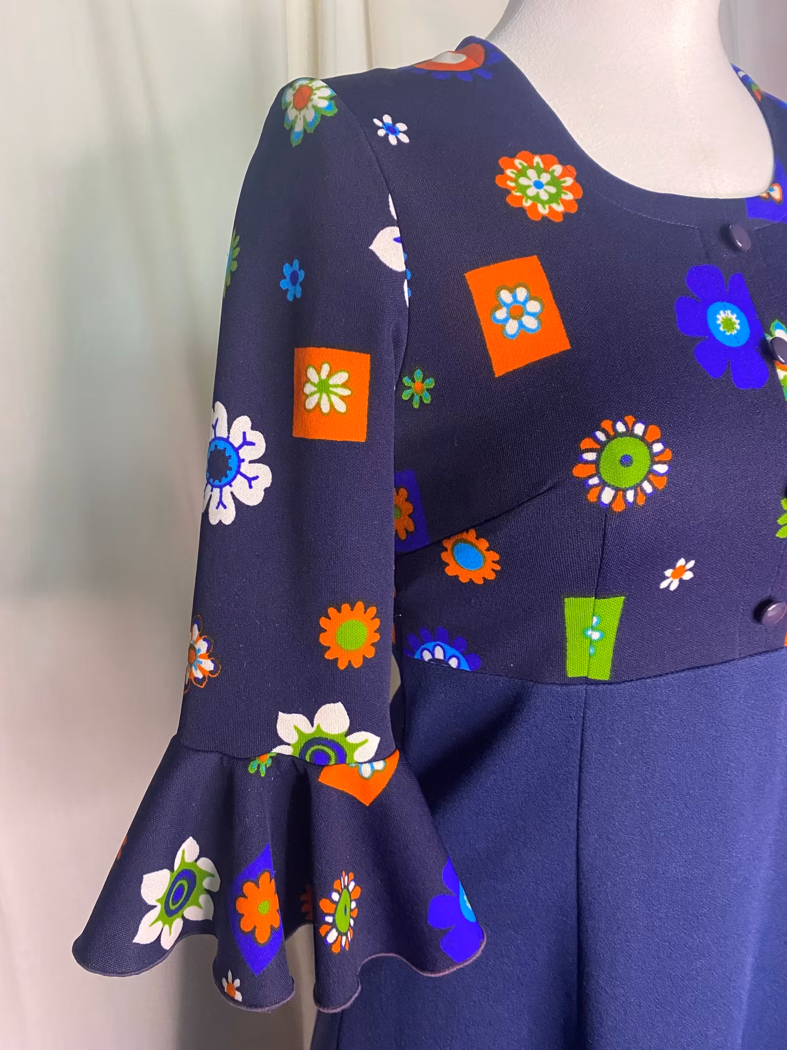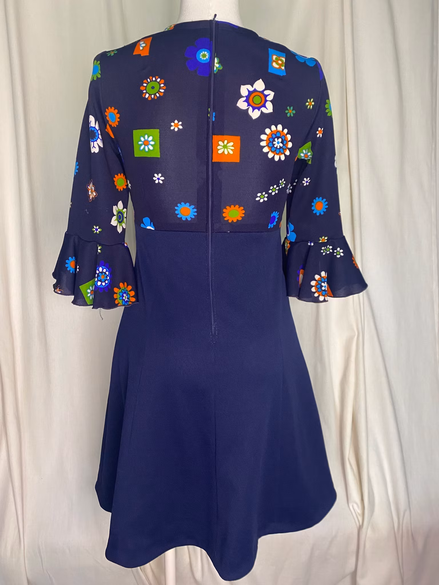 70-tals vintage klänning,3/4 ärmar med volang, dragkedja i ryggen