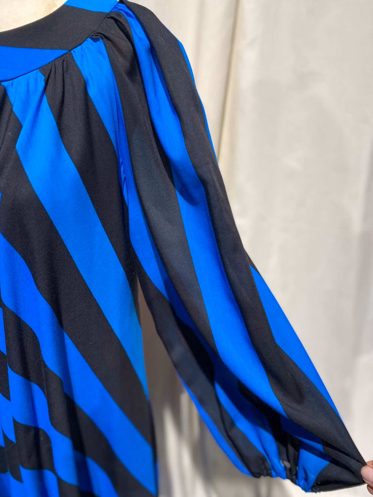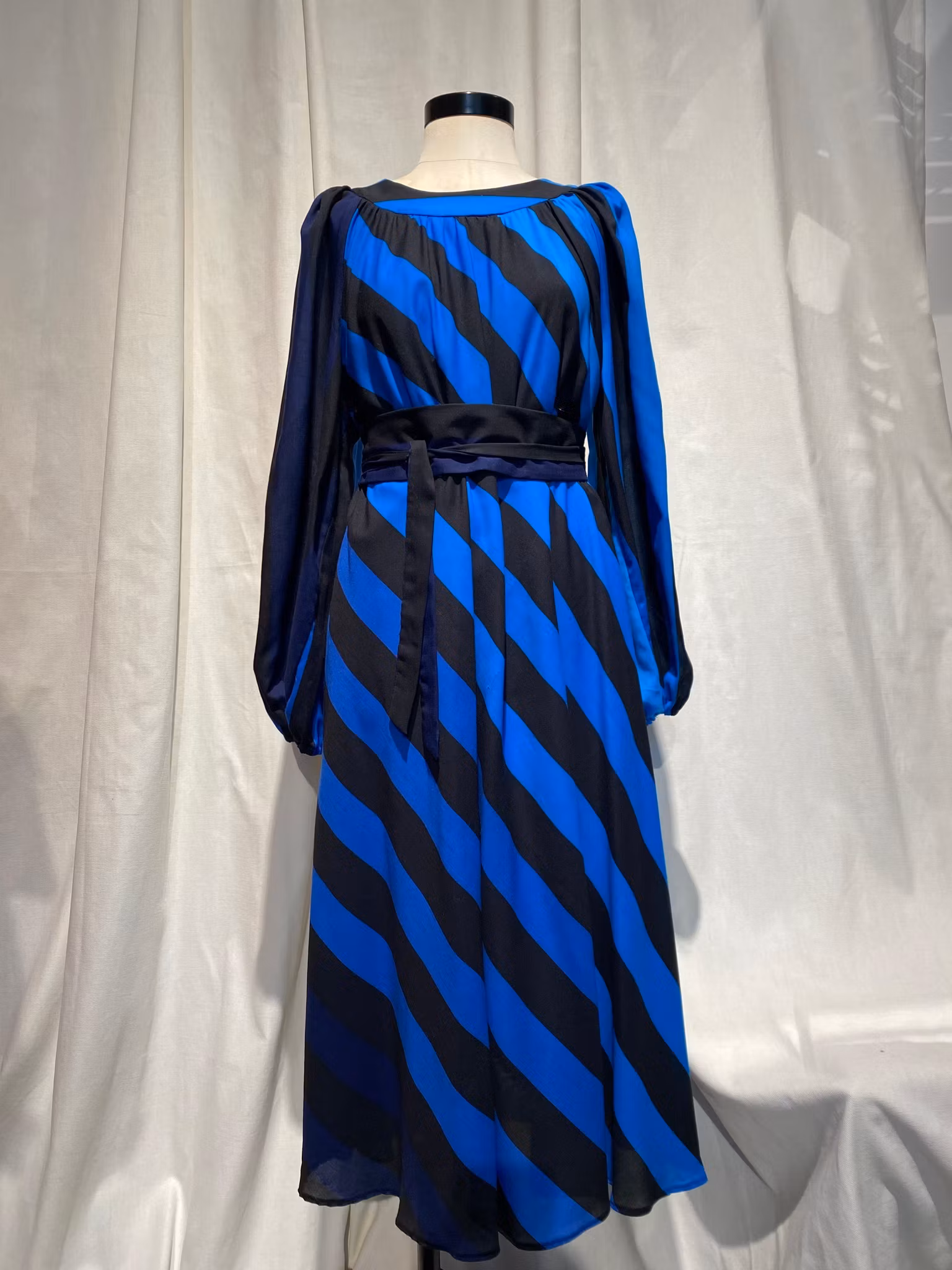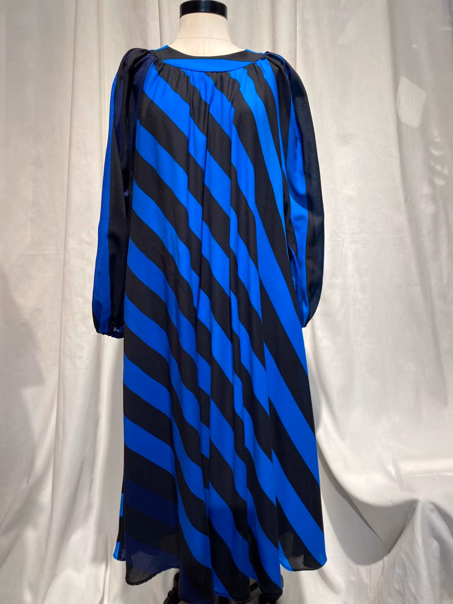 Blå/svart randig klänning i polyester från Heikkila Finland , fodrad, dragkedja i ryggen , en liten defekt på framsidan, se sista bilden