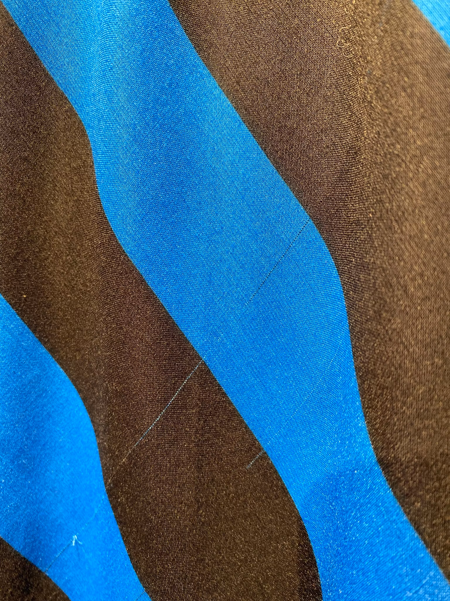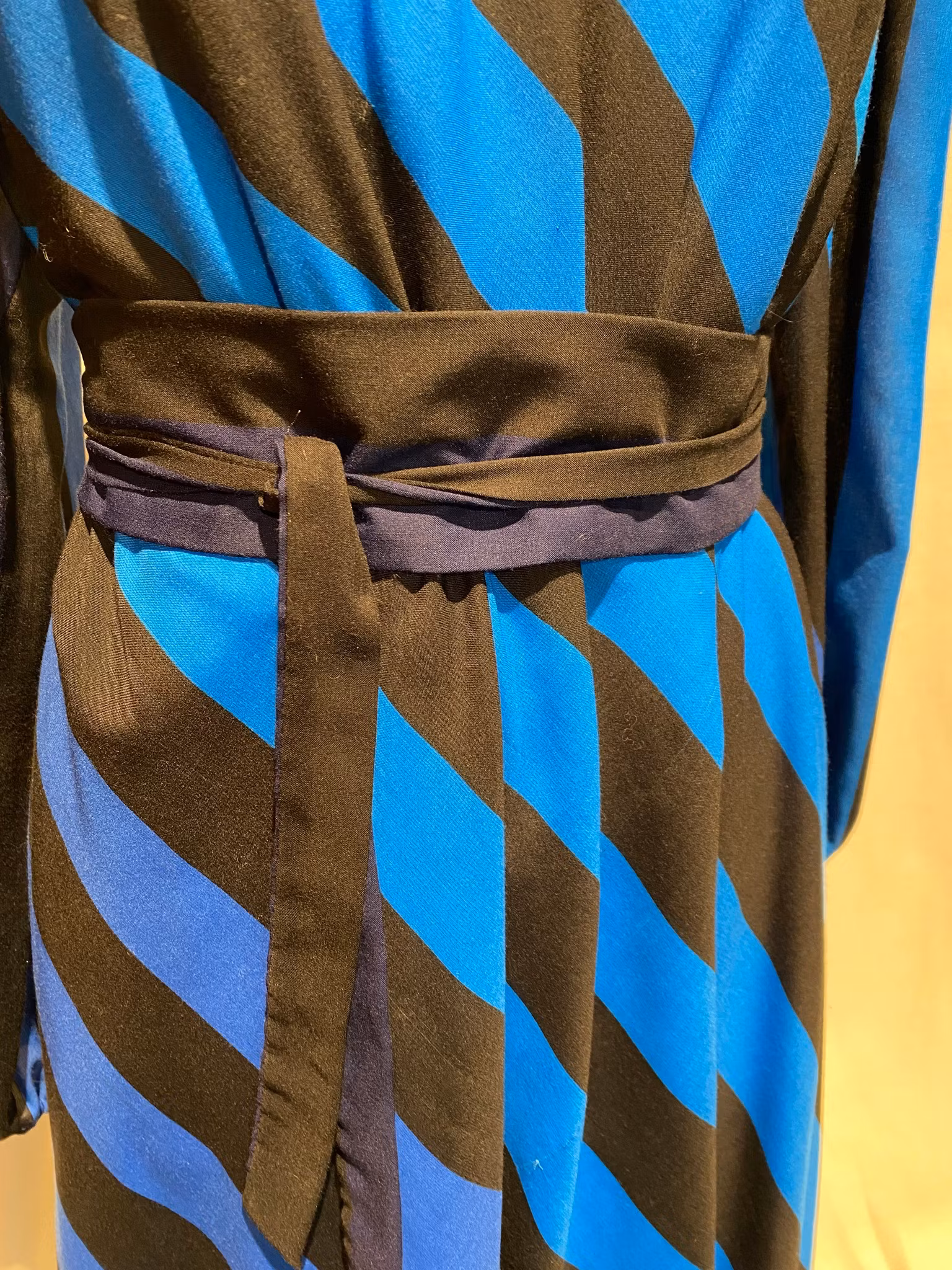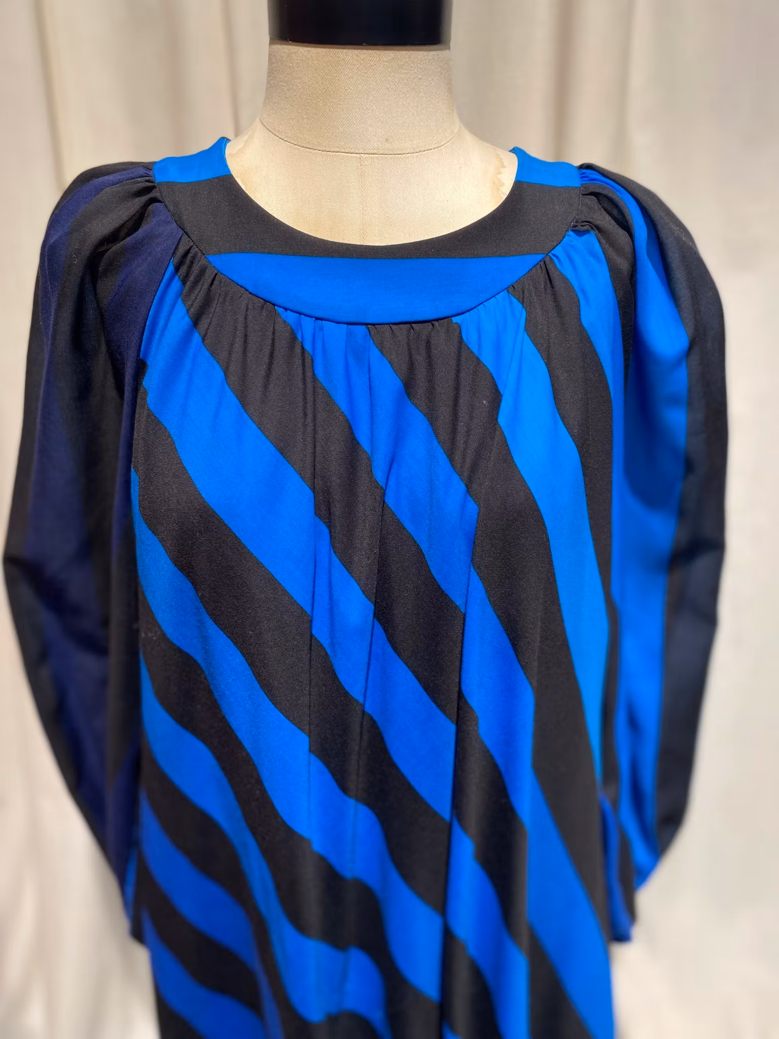 Blå/svart randig klänning i polyester från Heikkila Finland , fodrad, dragkedja i ryggen , en liten defekt på framsidan, se sista bilden