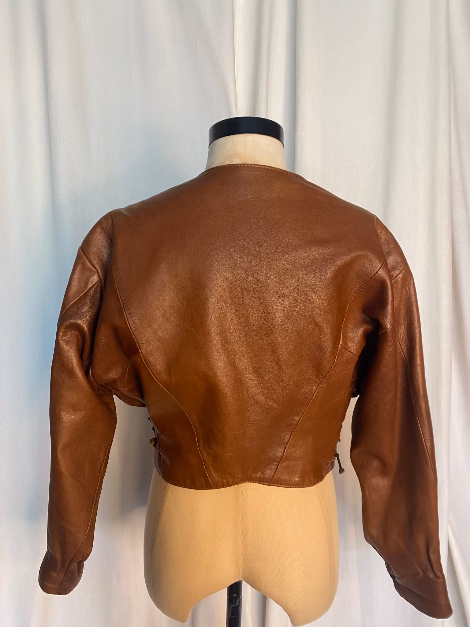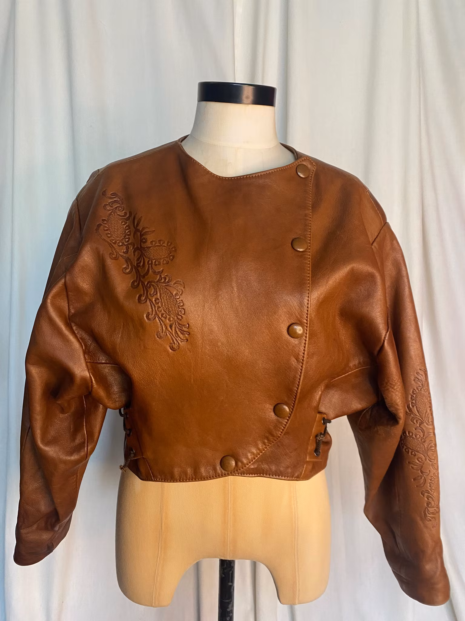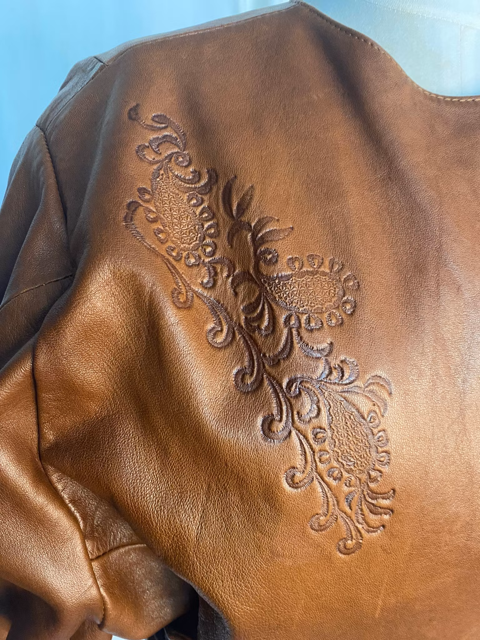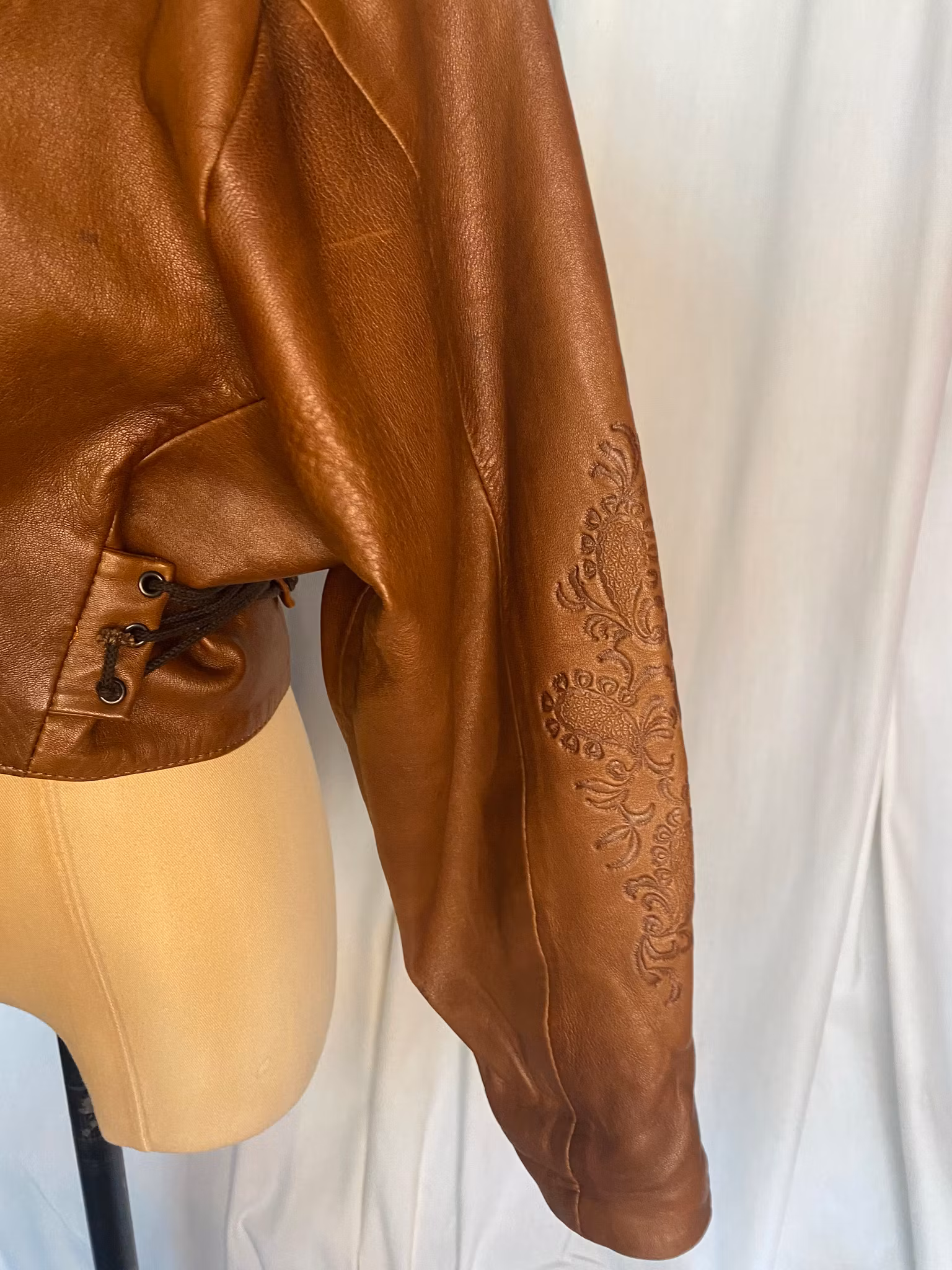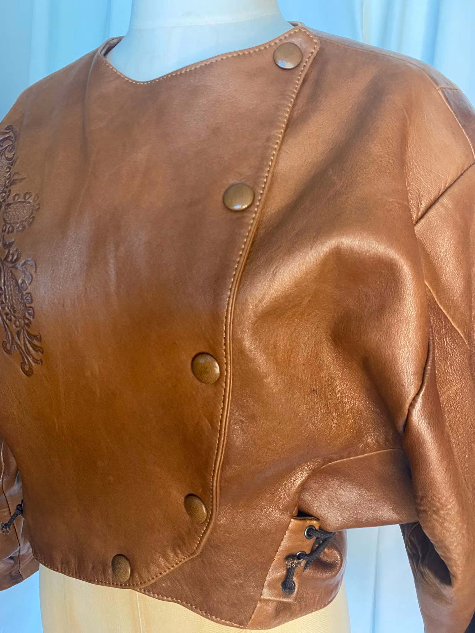 80-tals läder jacka i finaste kvalité, tryck broderi, fina detaljer som kläda tryckknappar och snörning på båda sidorna