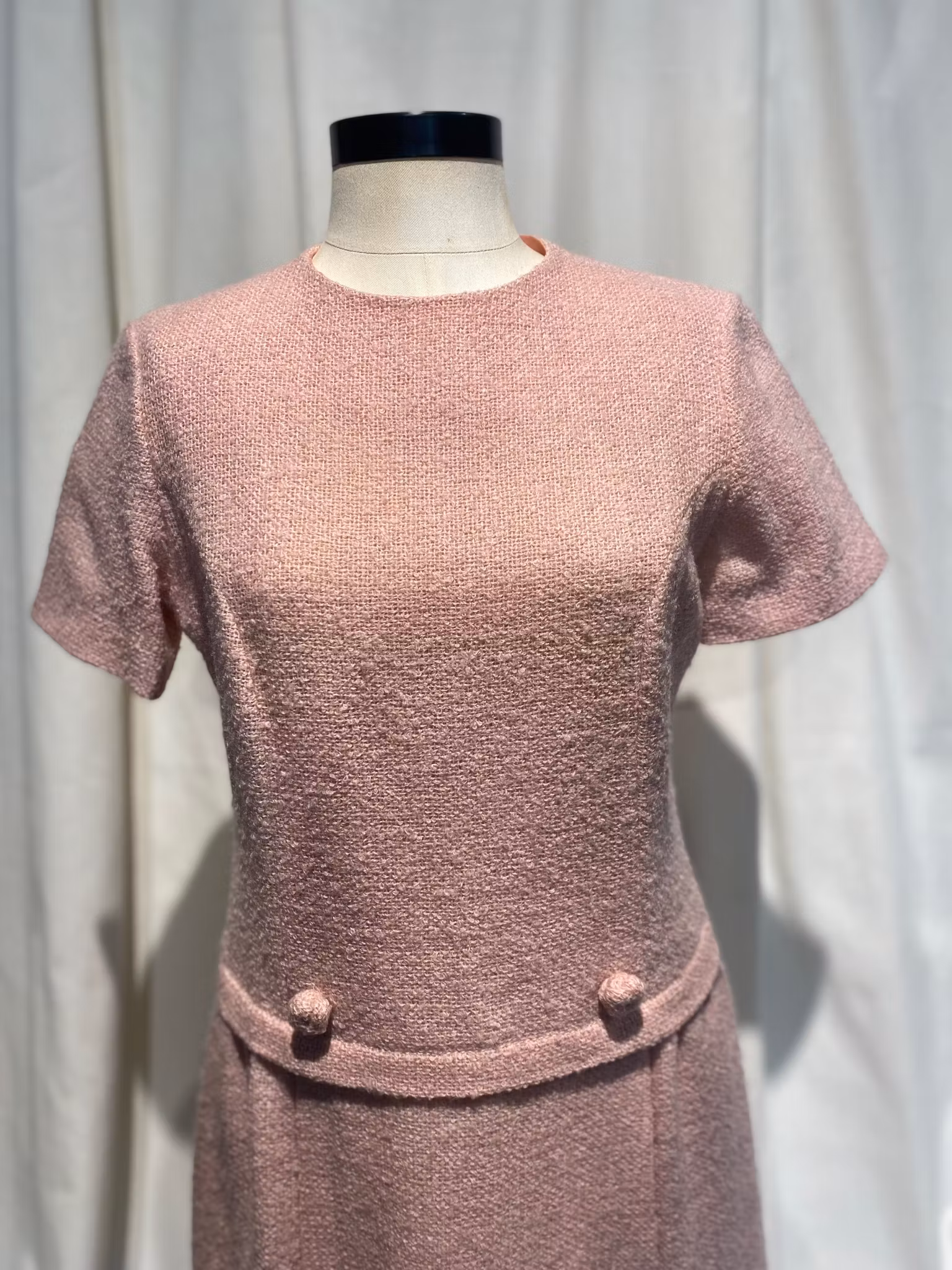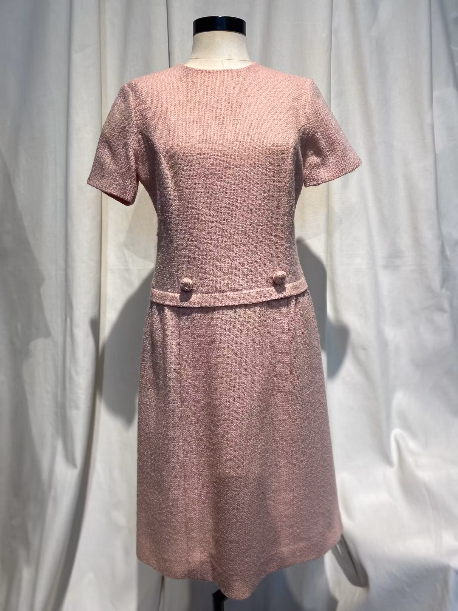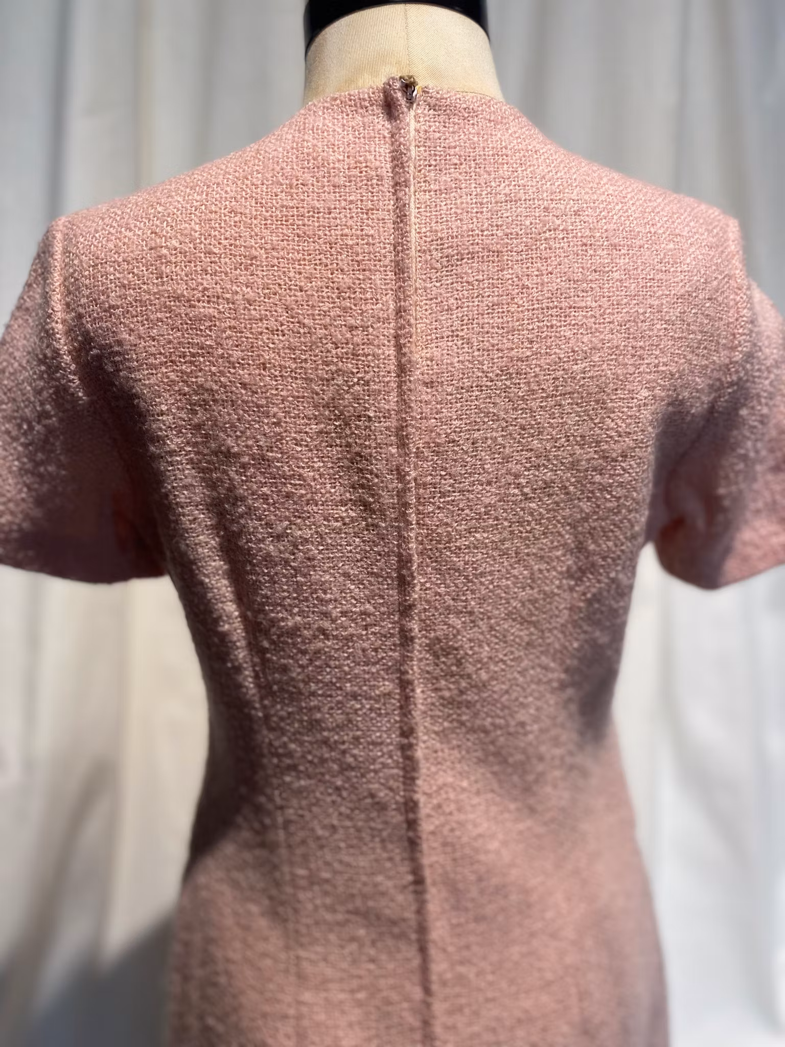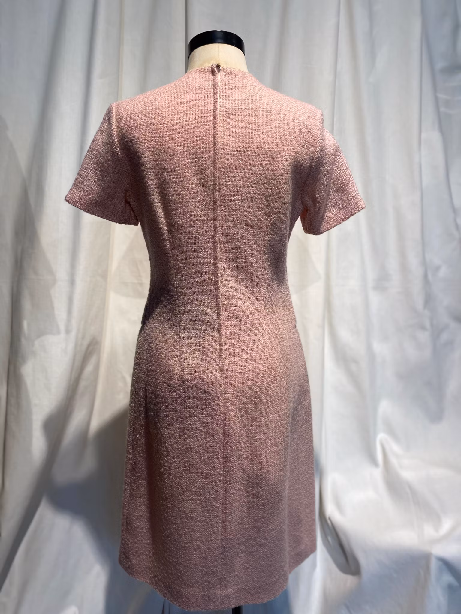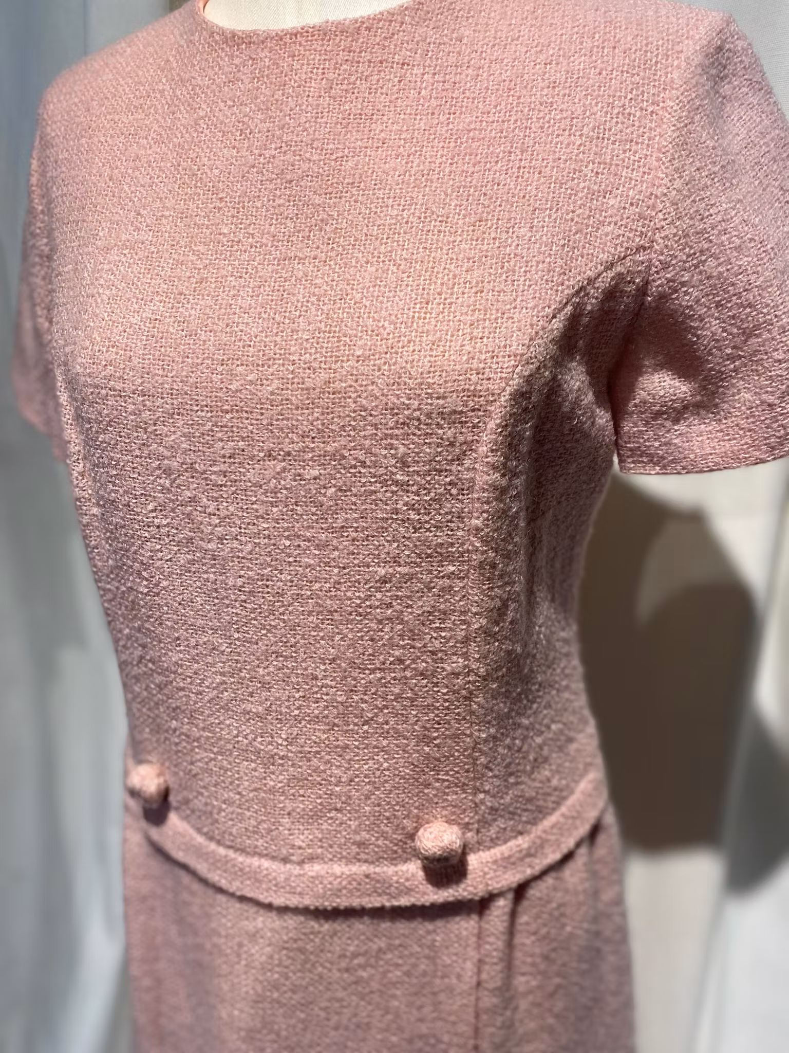Rosa ylle klänning från Sallens Modell, kortärmad, dragkedja i ryggen, dolda fickor på framsidan, fodrat, dekorativa klädda knappar.
