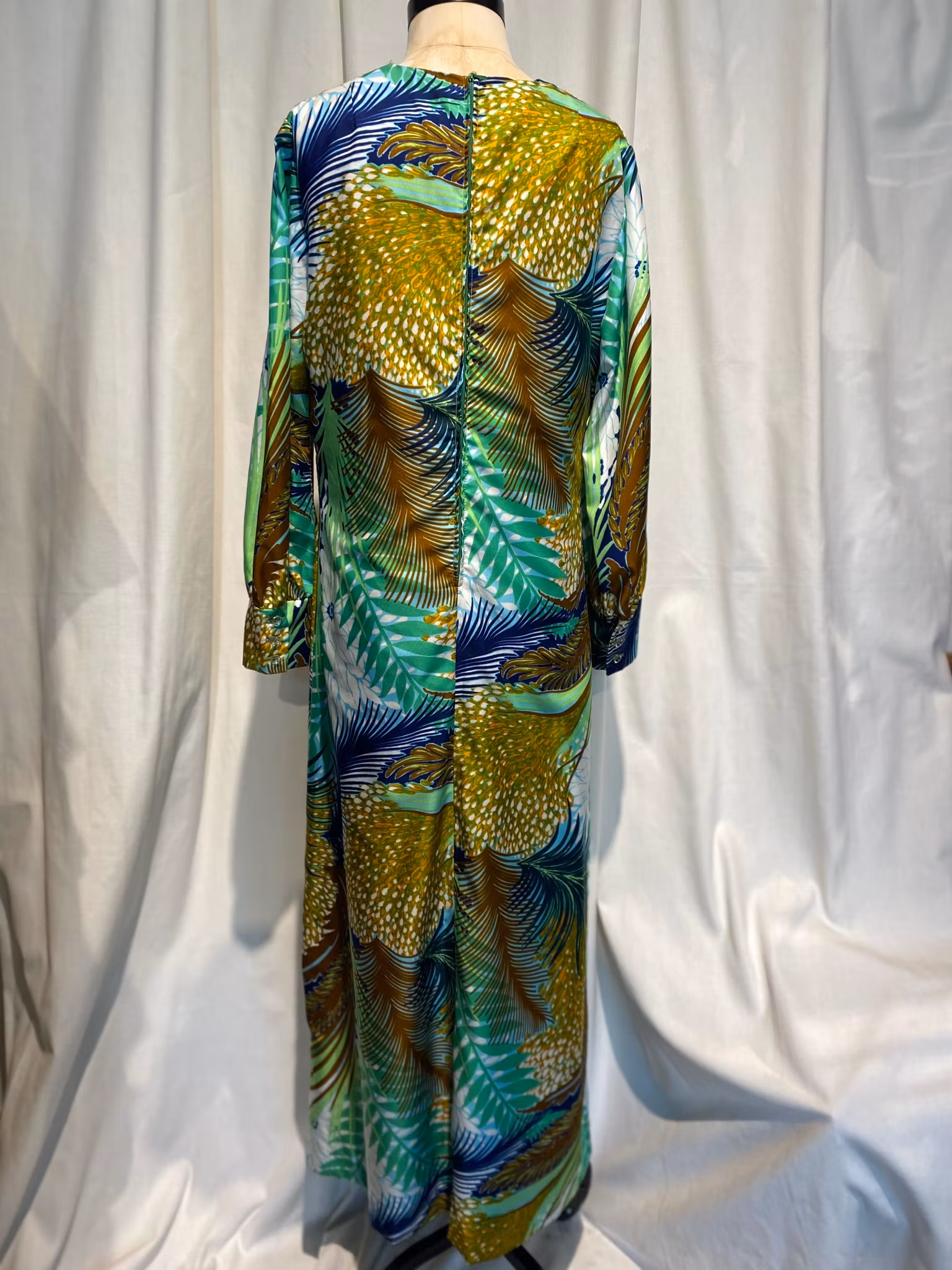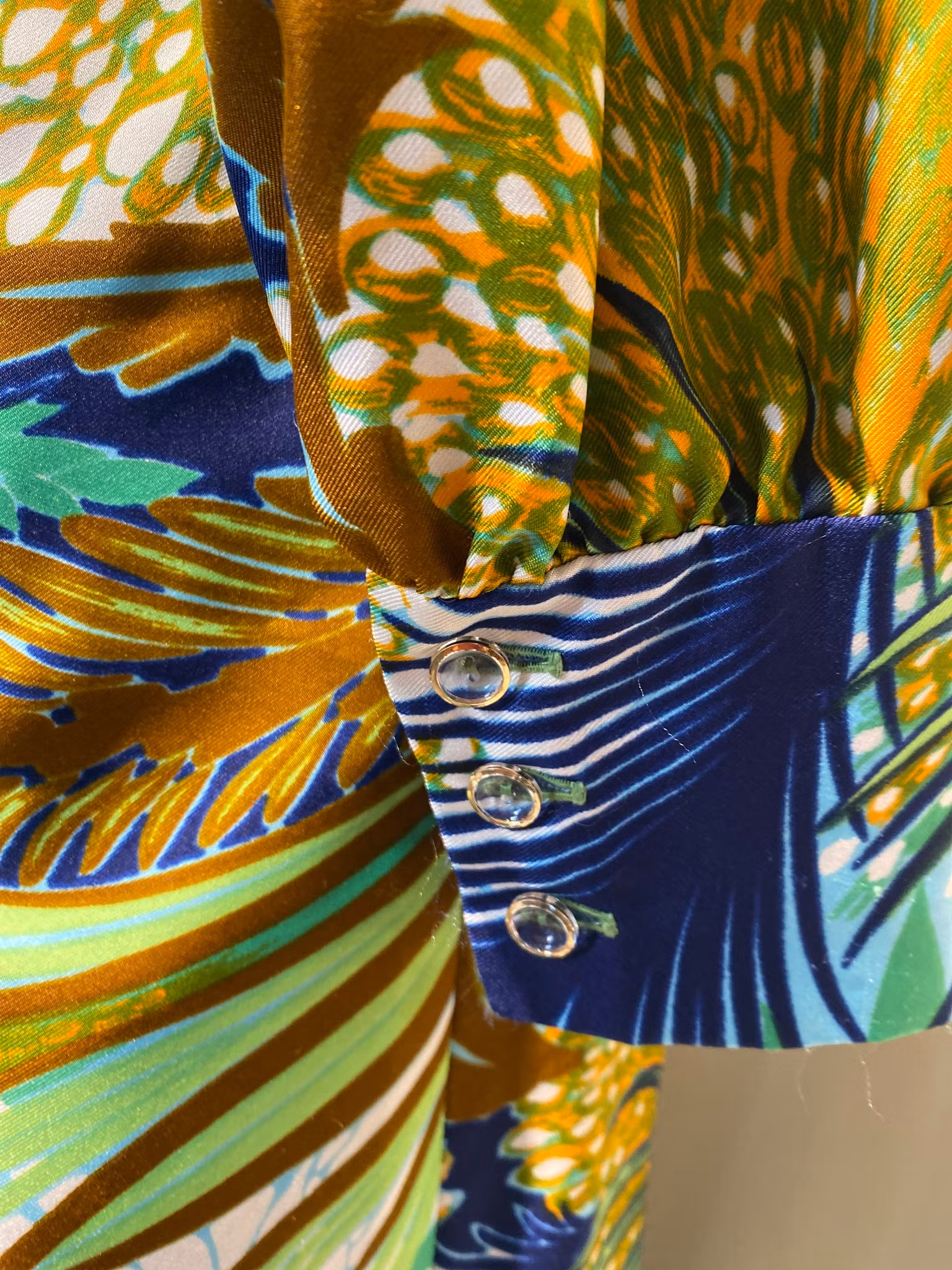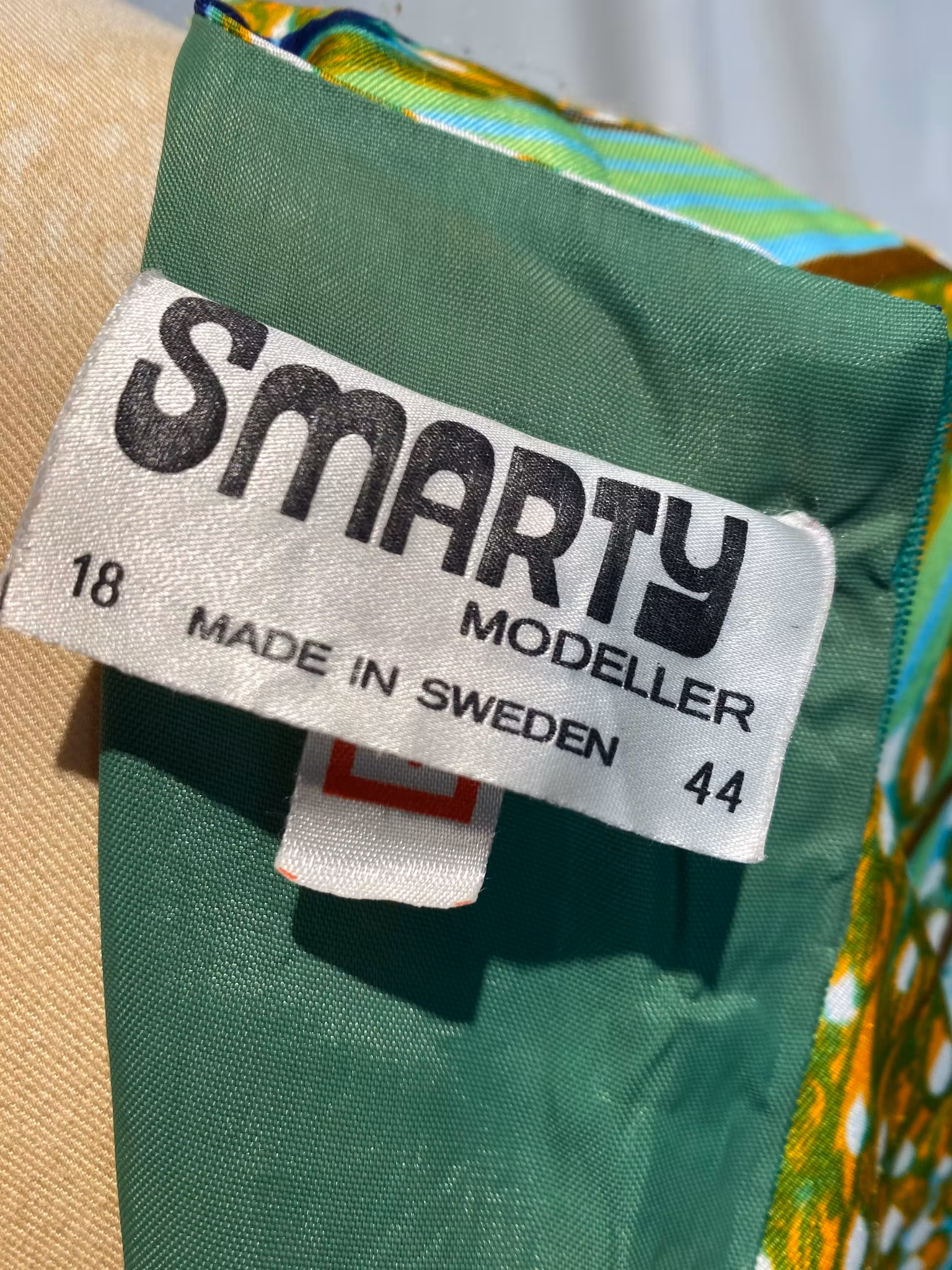 Lång 70-tals klänning från Smarty Sweden i satin. Dekorativa knappar på ärmarna, fin sick