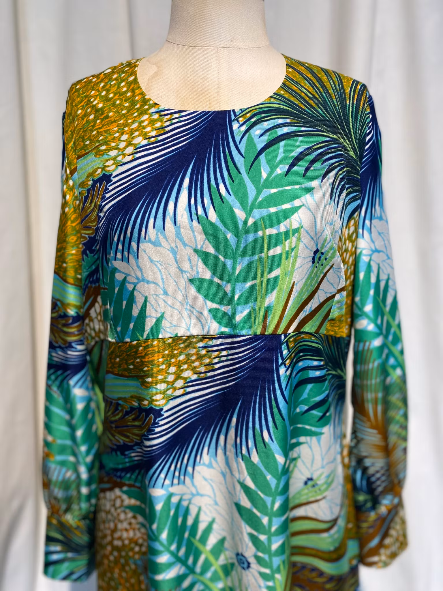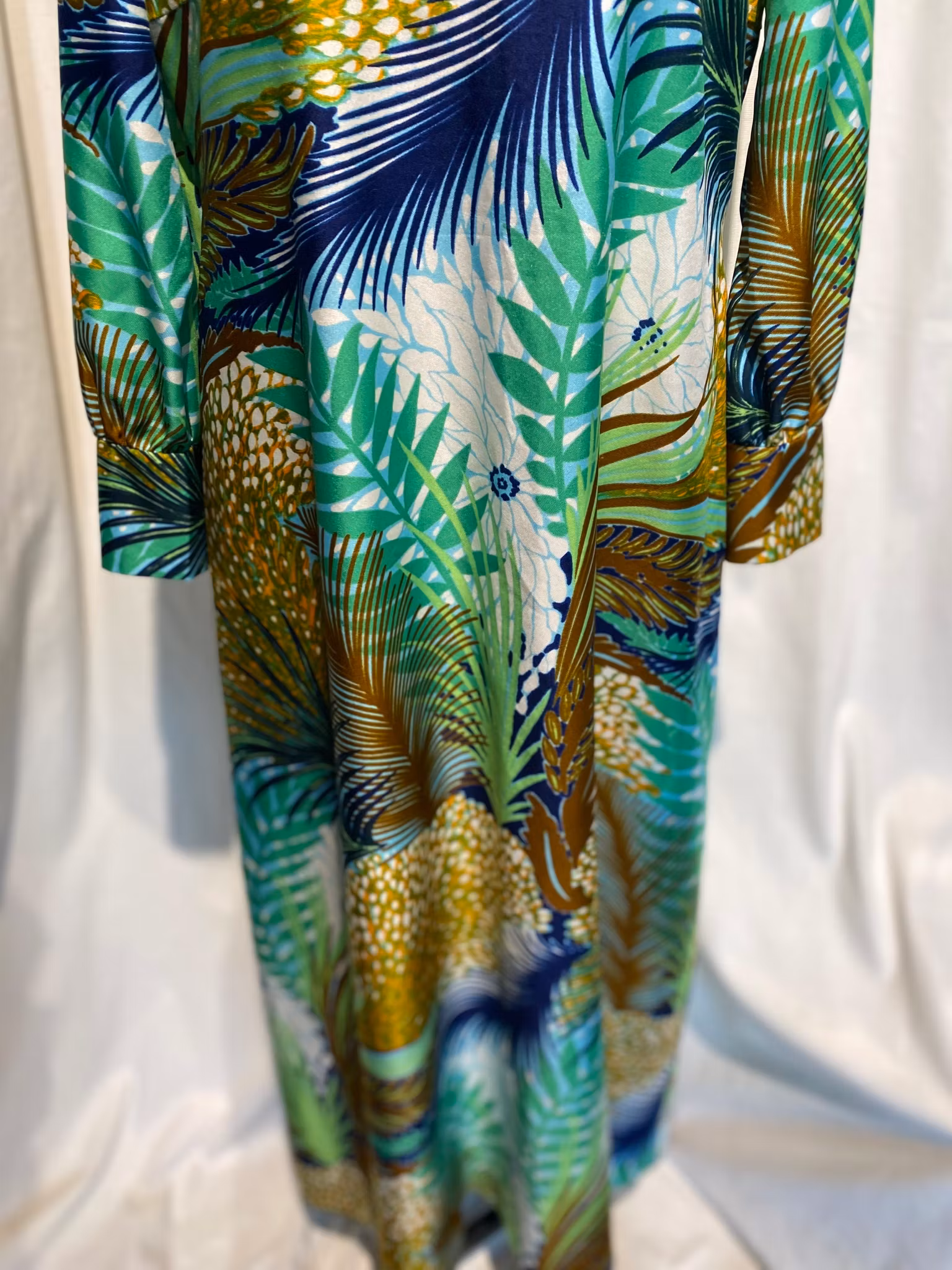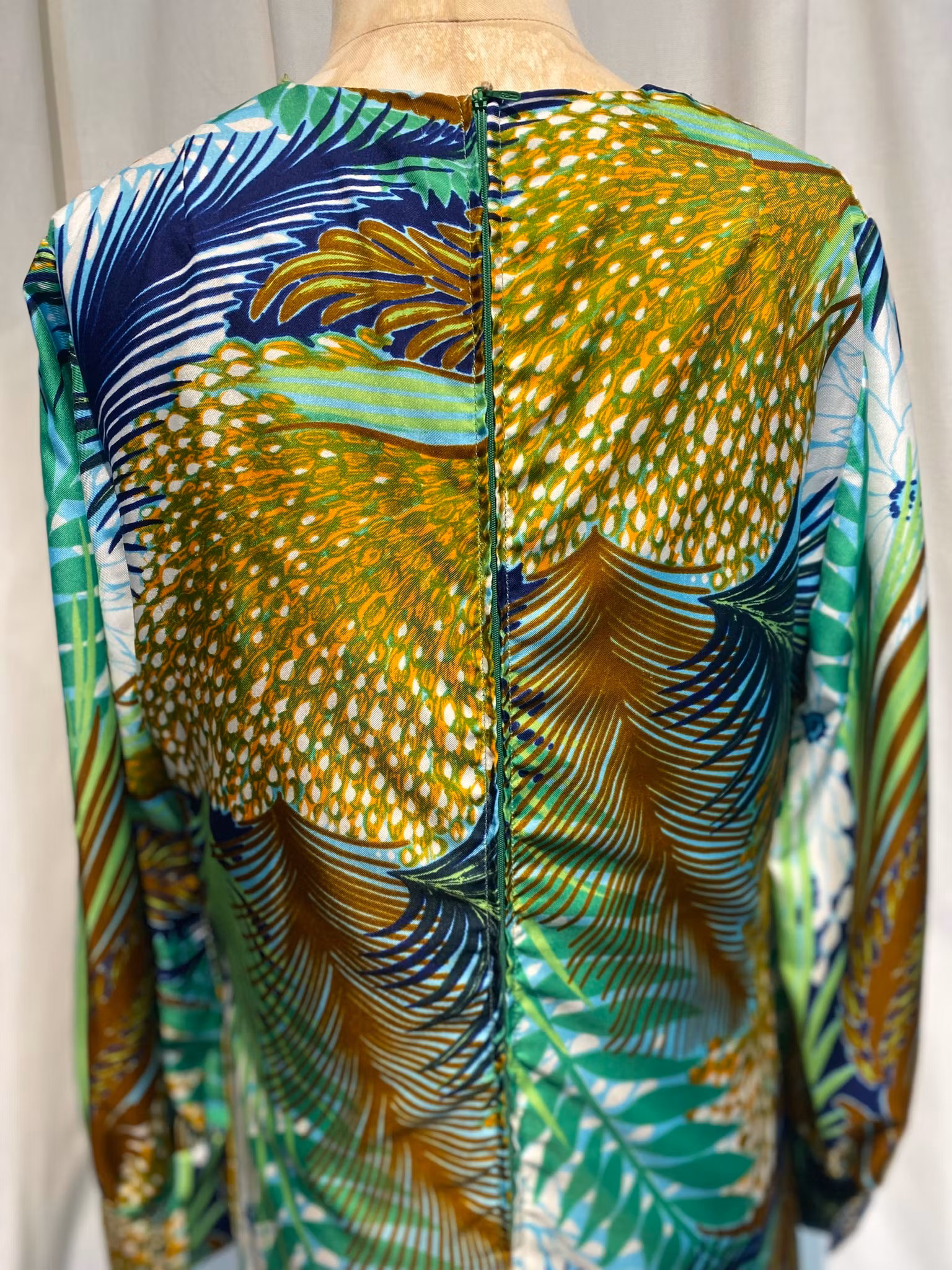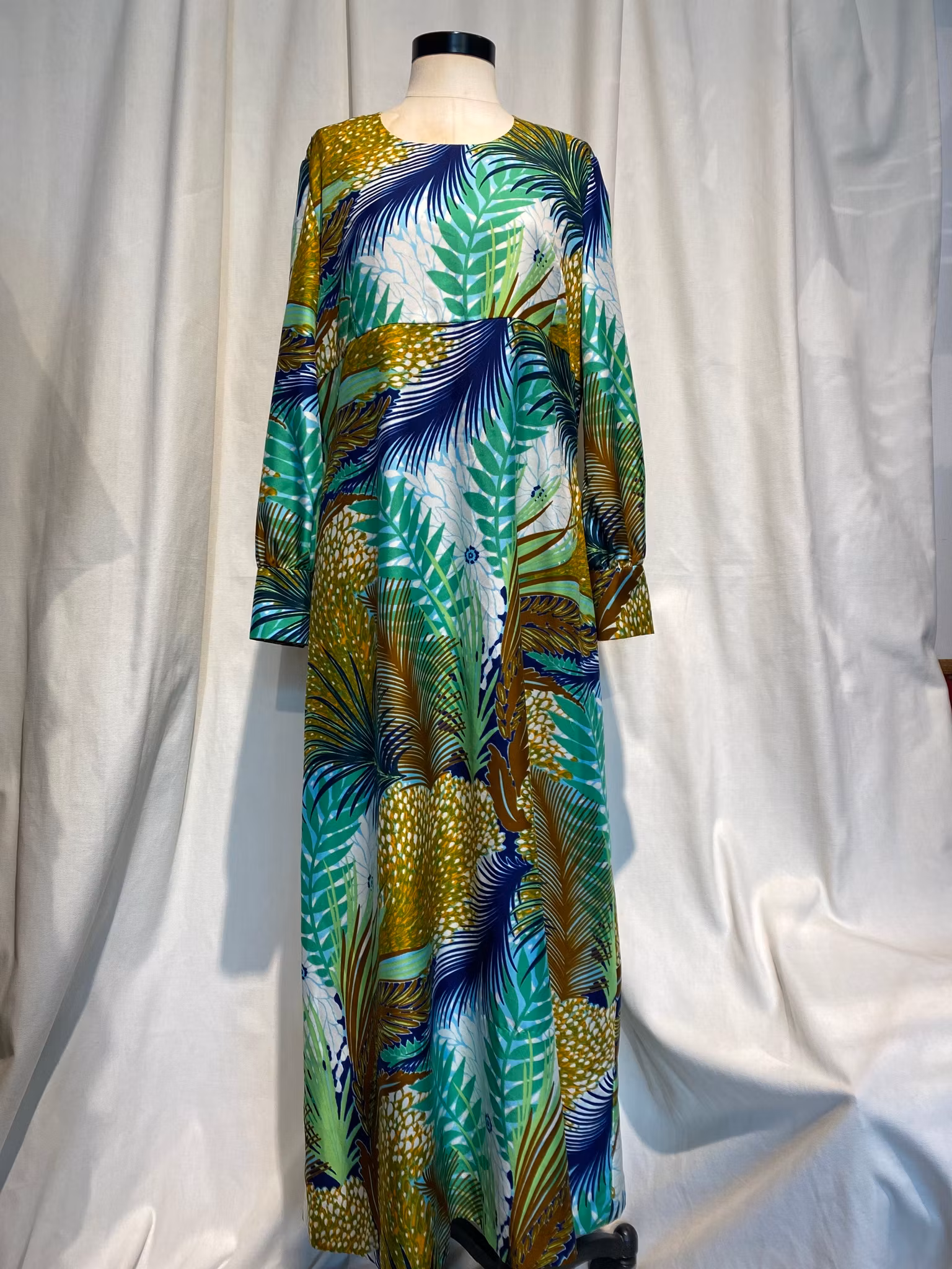 Lång 70-tals klänning från Smarty Sweden i satin. Dekorativa knappar på ärmarna, fin sick