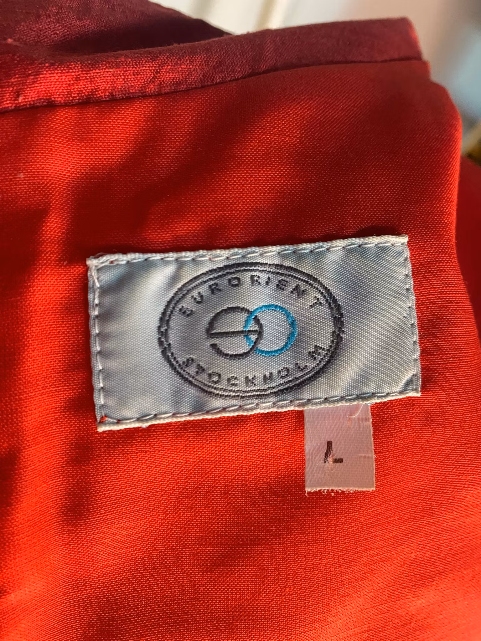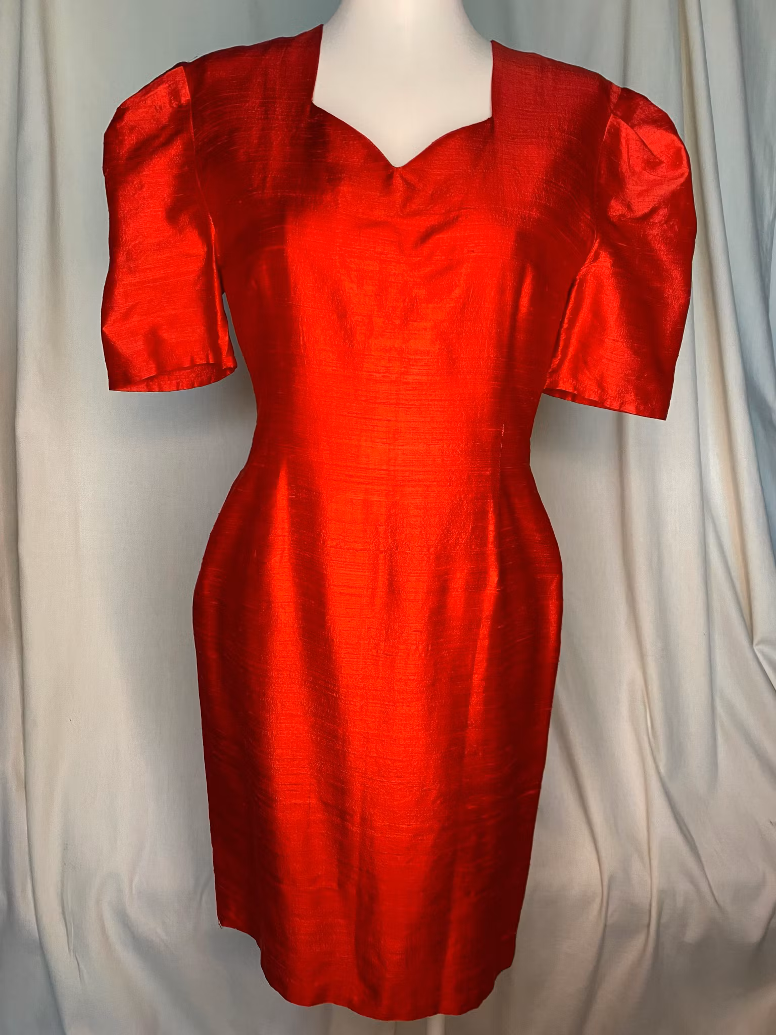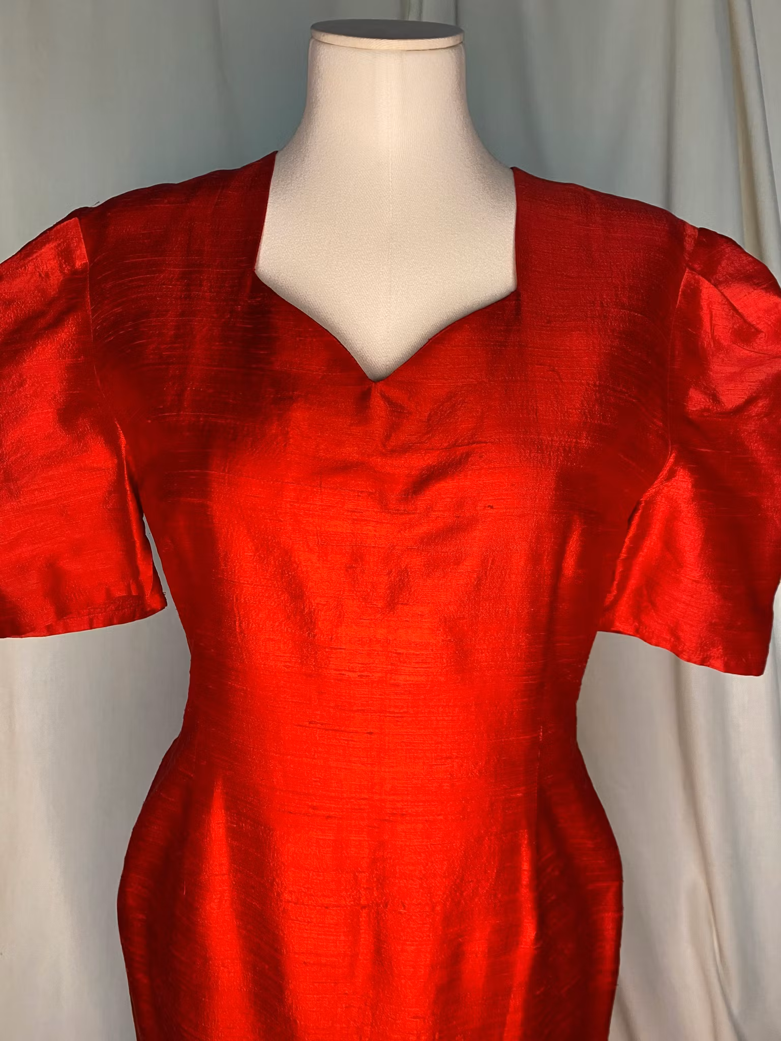 Röd klänning i siden, fodrat, markerat midja, dragkedja i ryggen, fin sick och kvalité