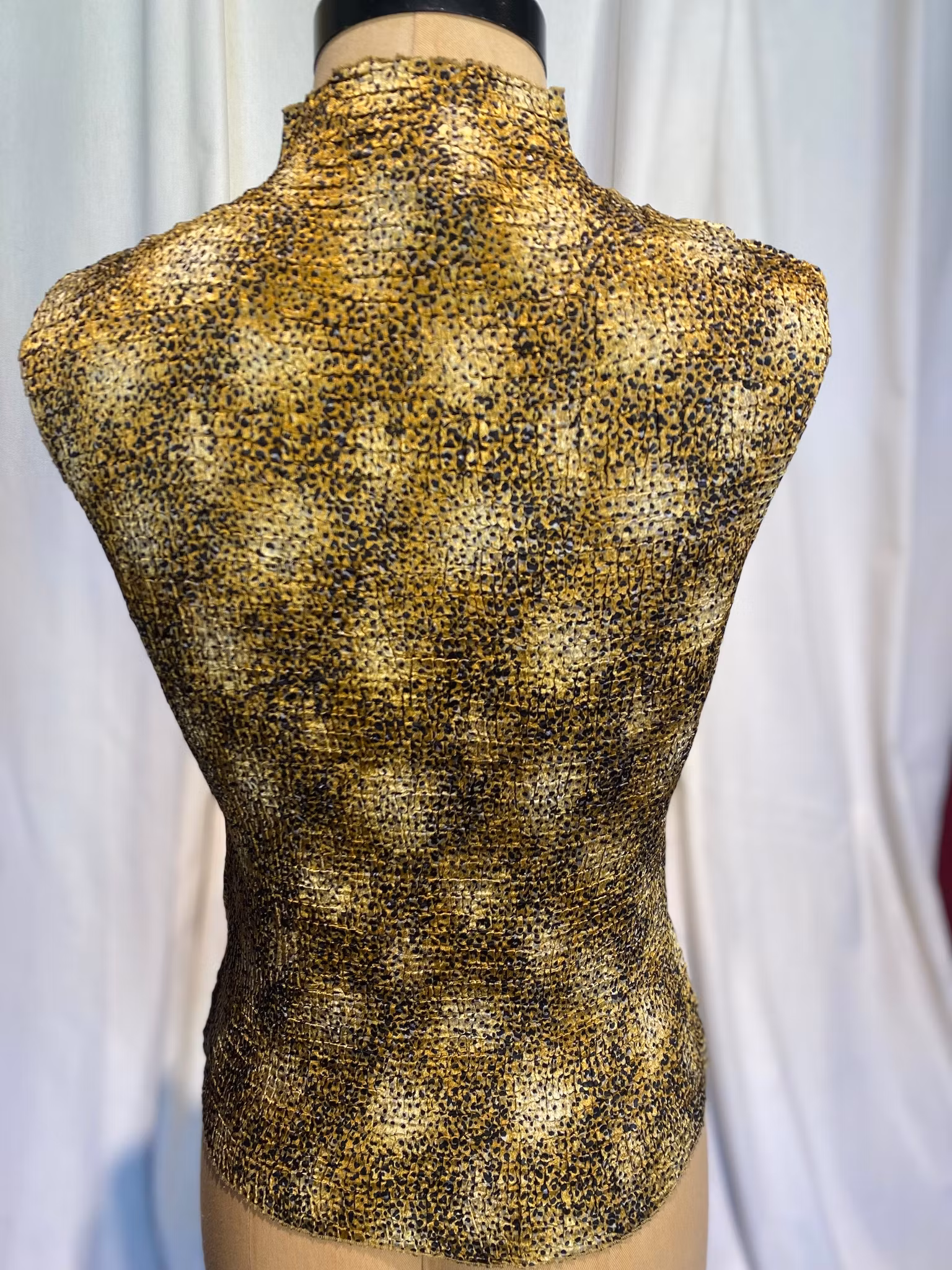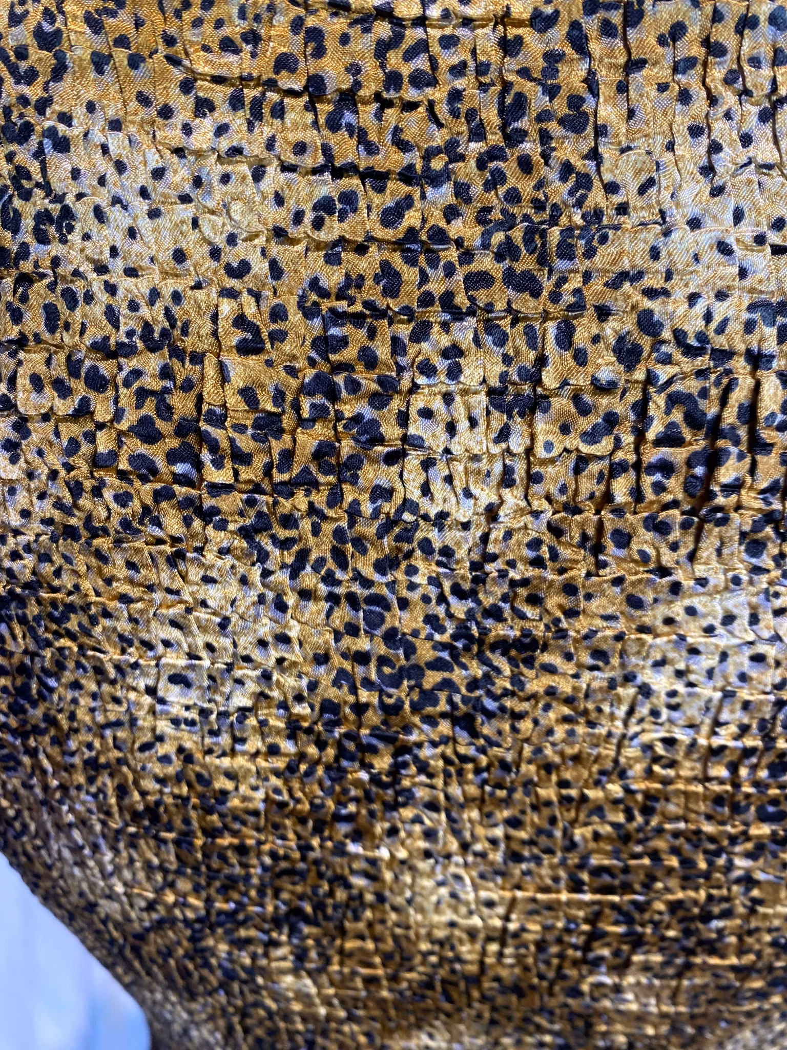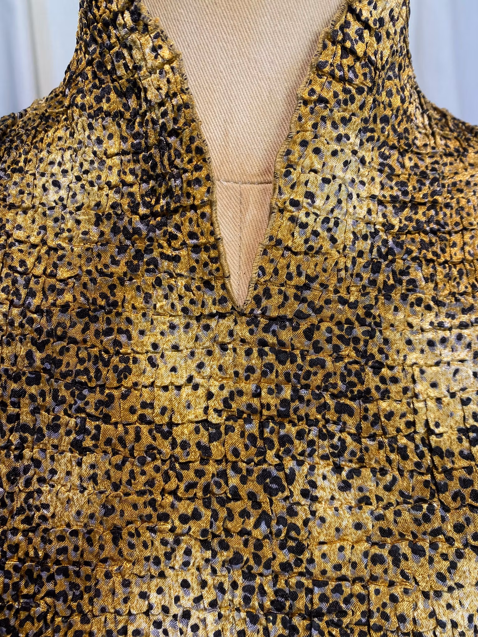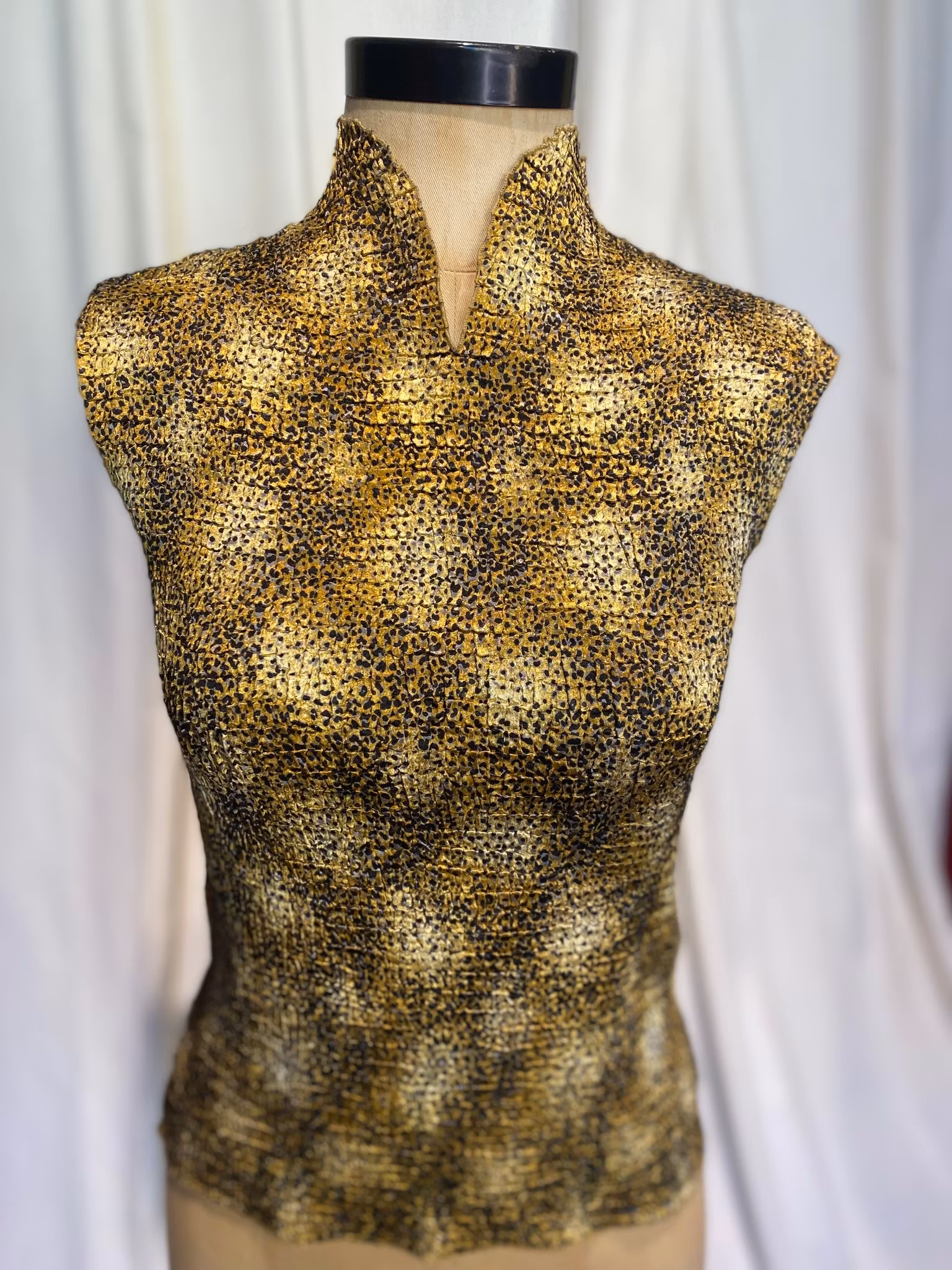 Guld topp med prickig mönster i polyester, struktur i tygget, glansig yta, stretch, öppning vid halsen, kort ärm, storlek S, fin sick