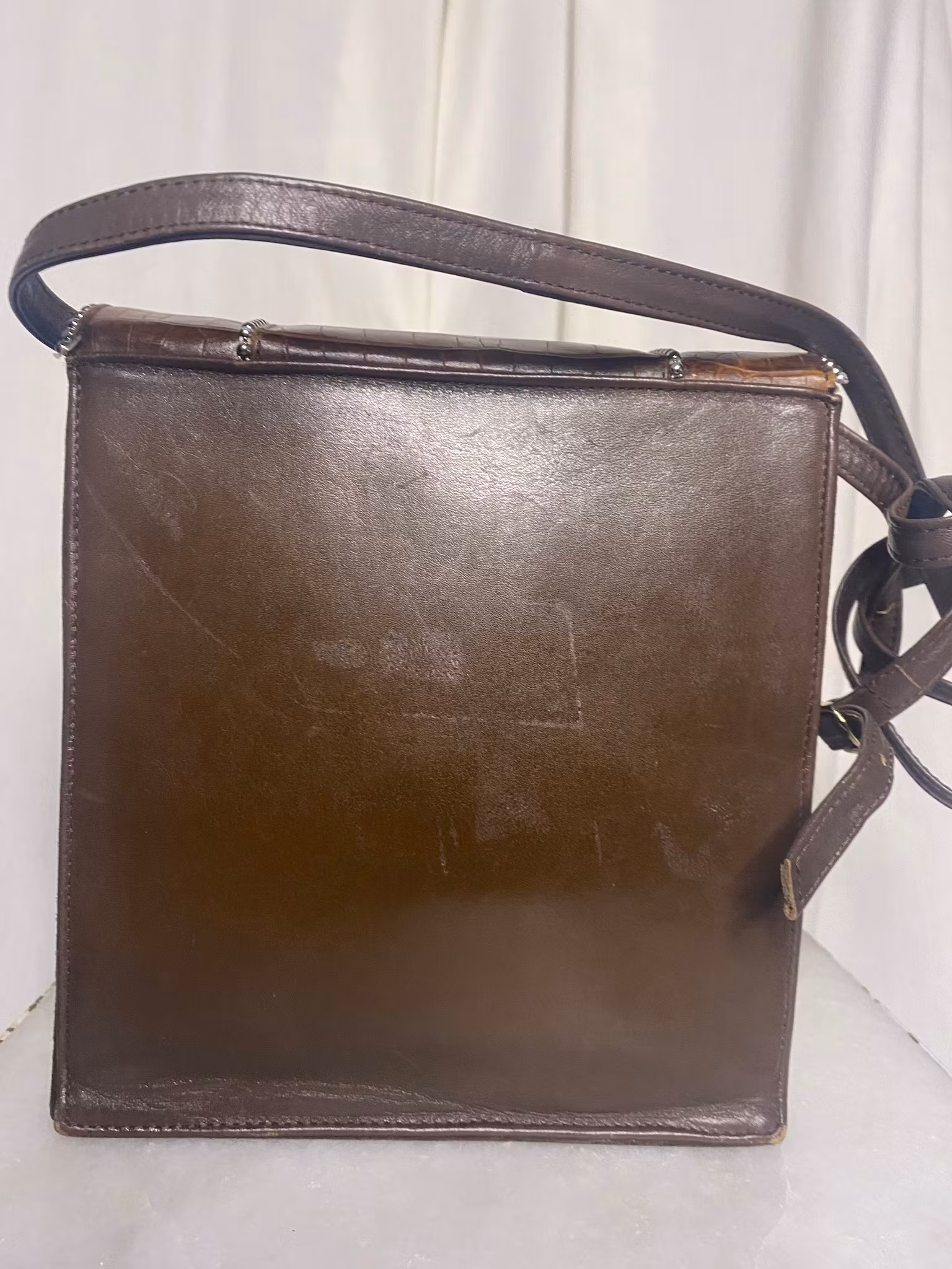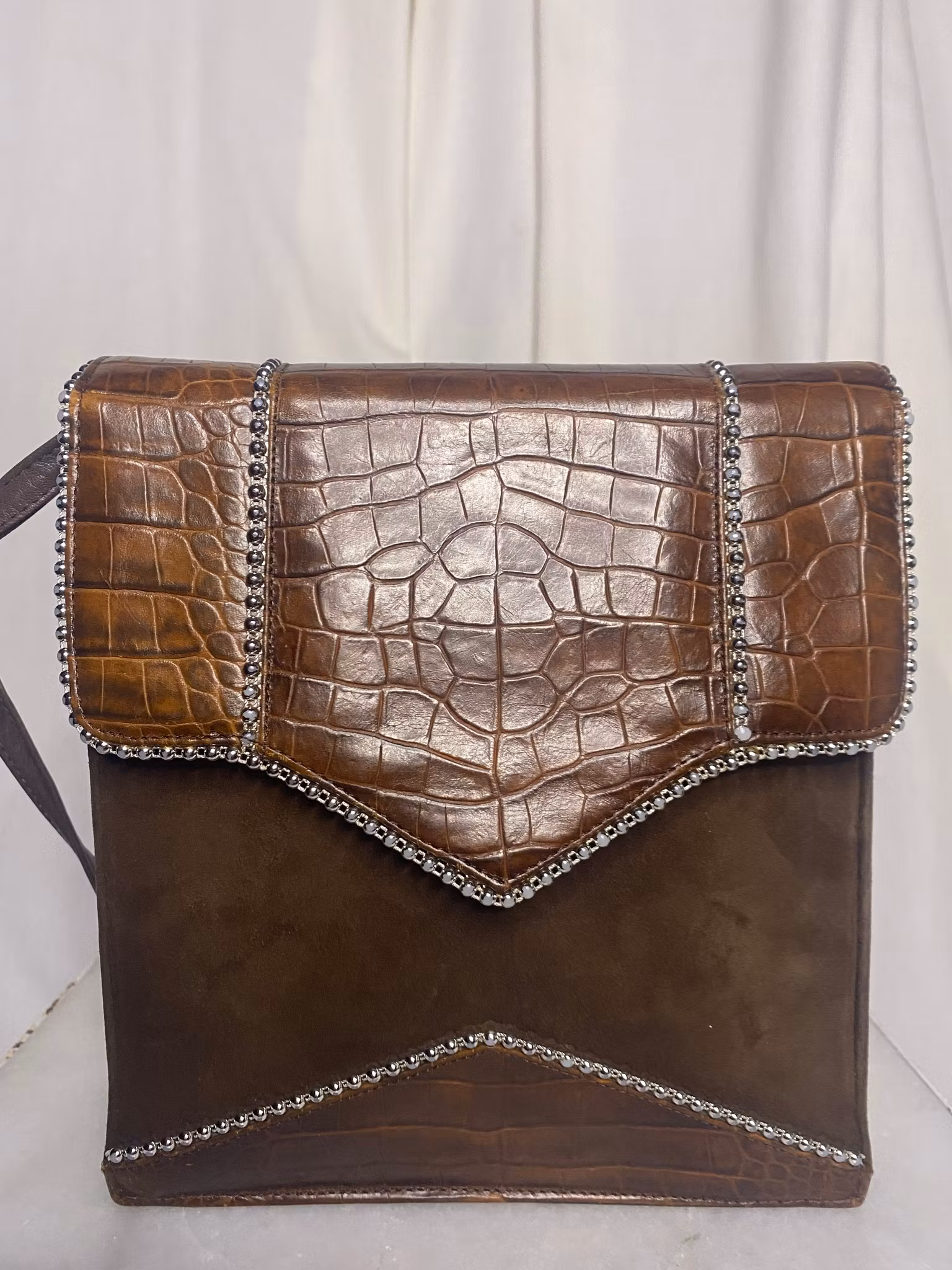 Brun väska i läder och mocka, axelrem, fina små pärlor som detaljer, små märke på baksidan av väskan ( se bild nr.2)