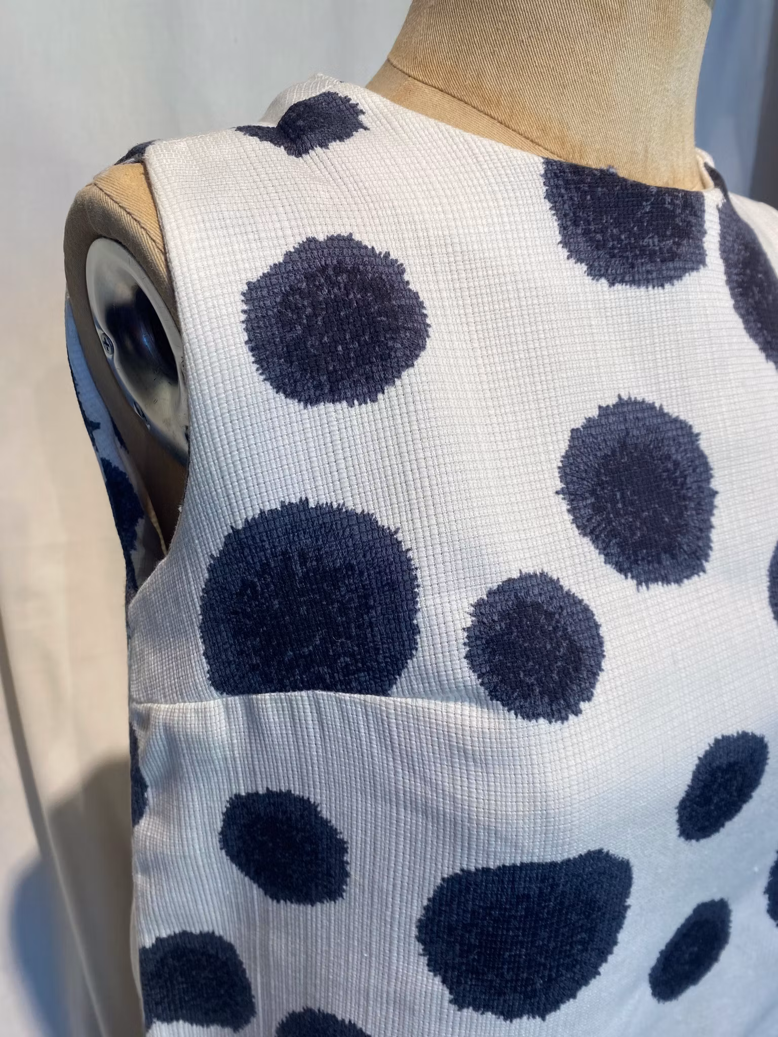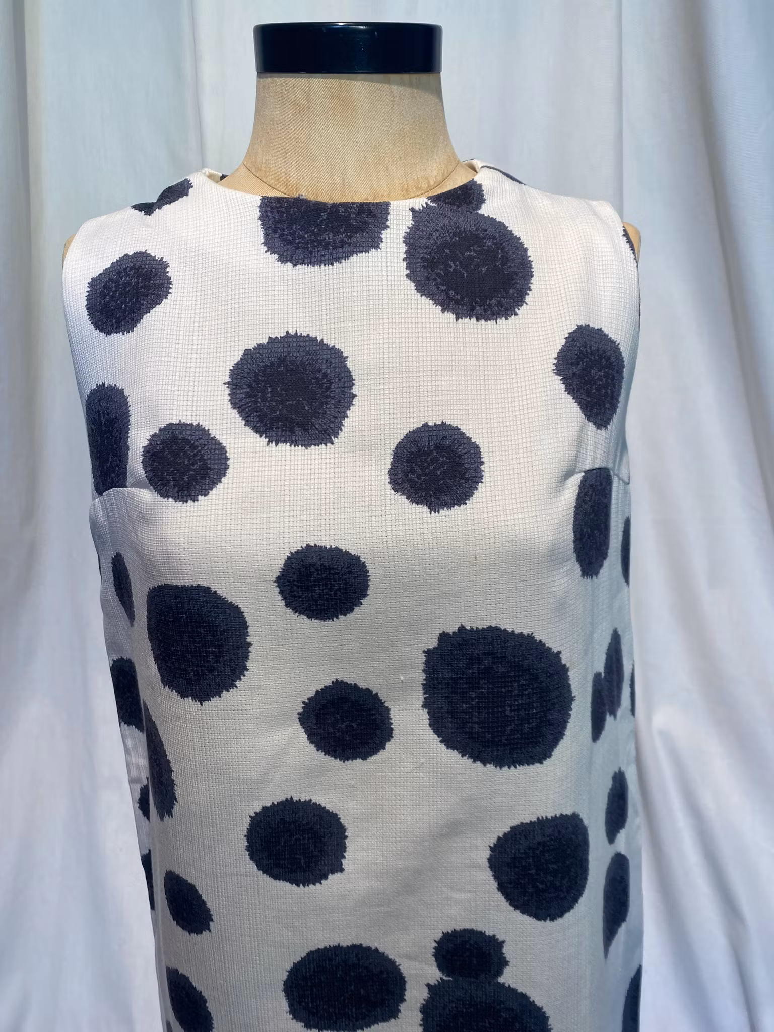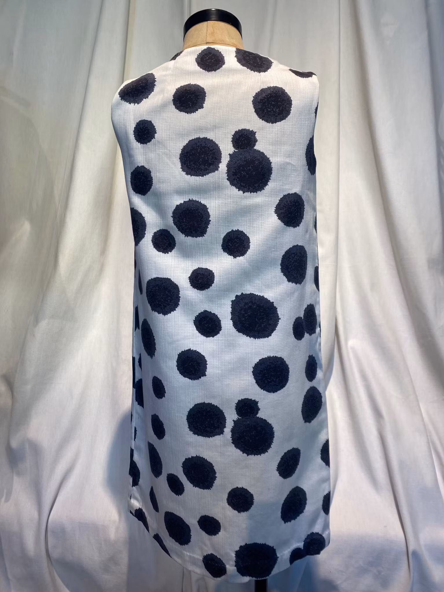 Ärmlös 60-tals klänning, vit med grå mönster, rak i modellen , bomull och polyester blandning, uppskattad storlek 34/36, fin sick