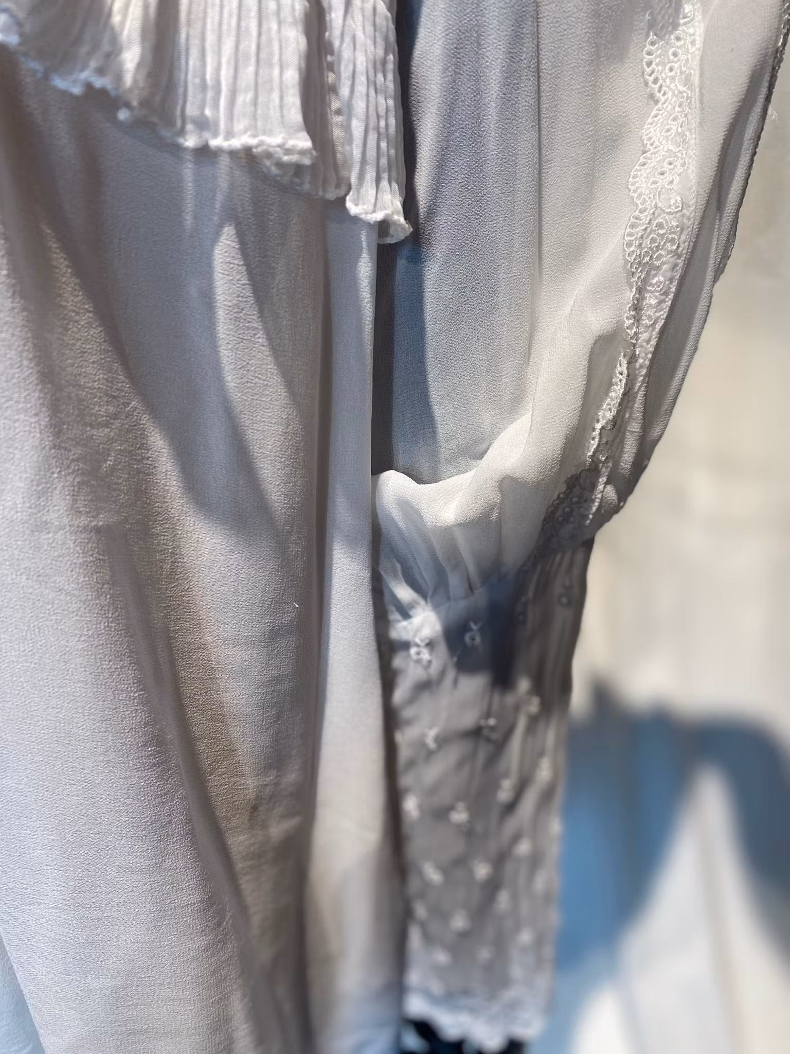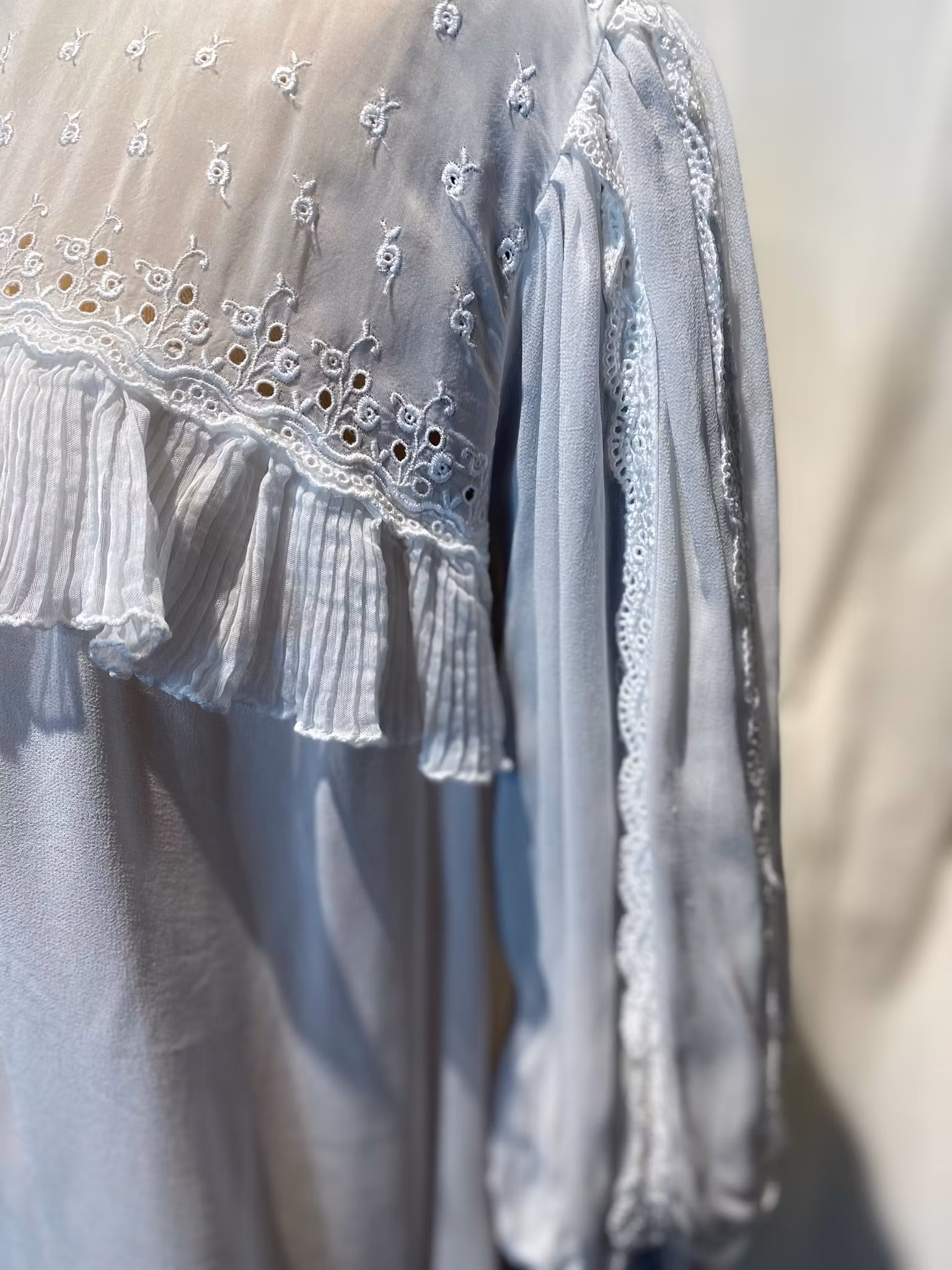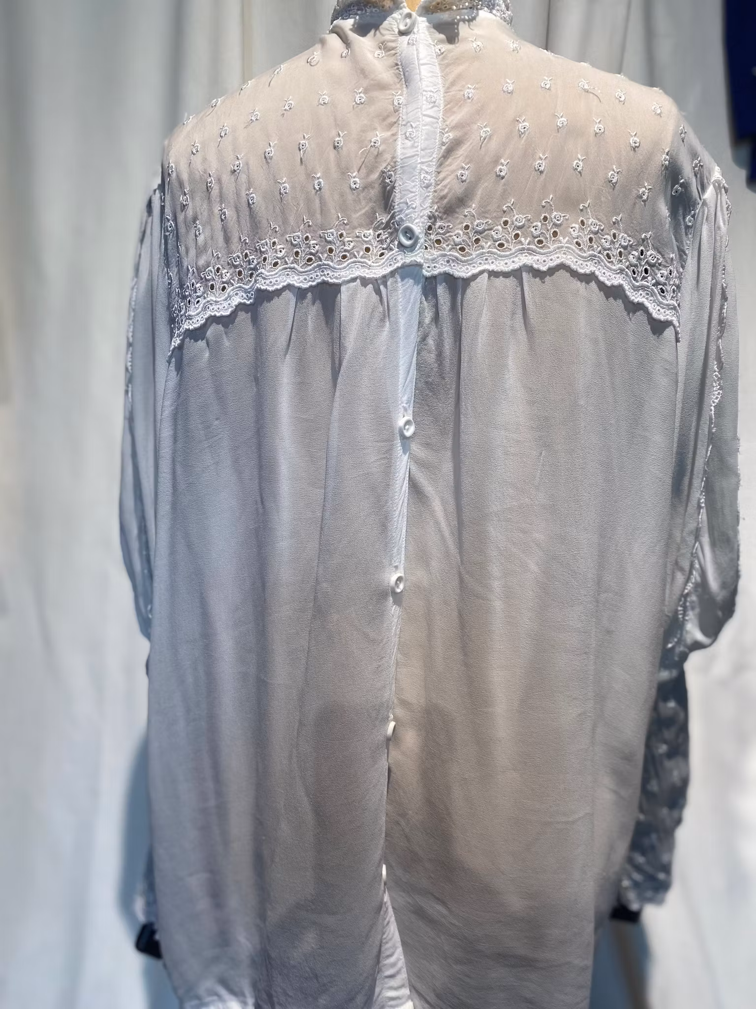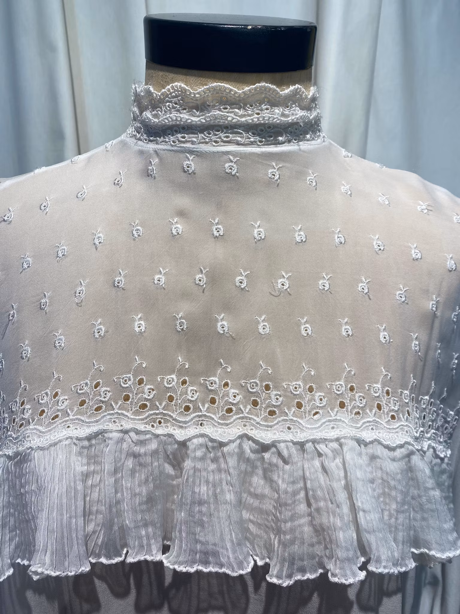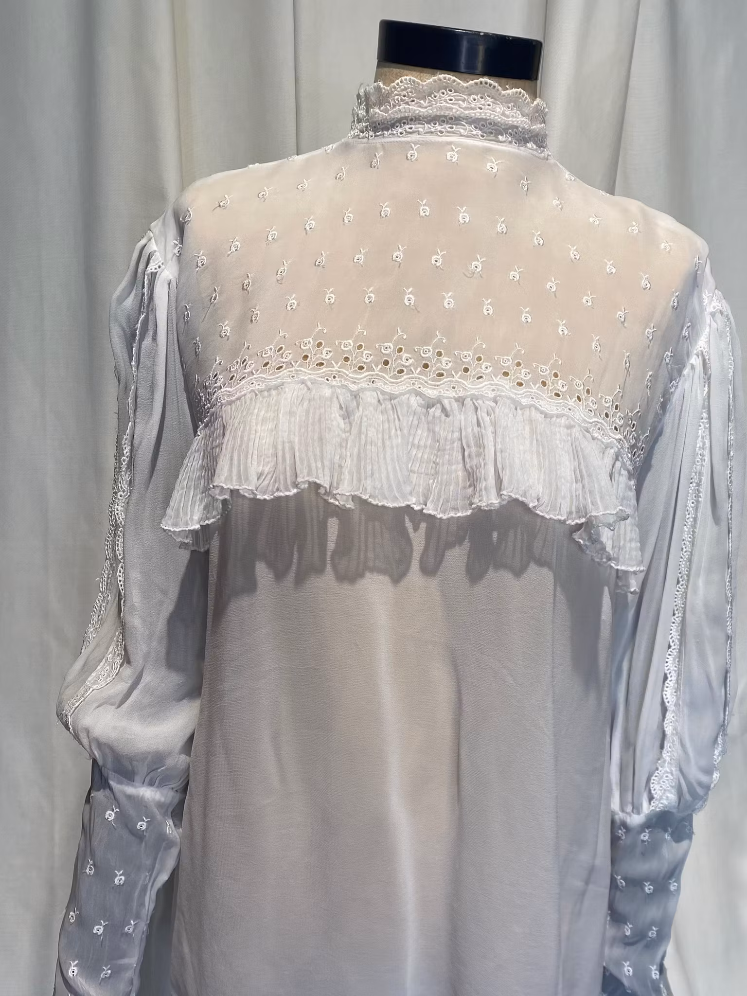 Vintage blus med spets och broderier, volang i mitten på framsidan. knappar i ryggen, fin sick , storlek 38/40