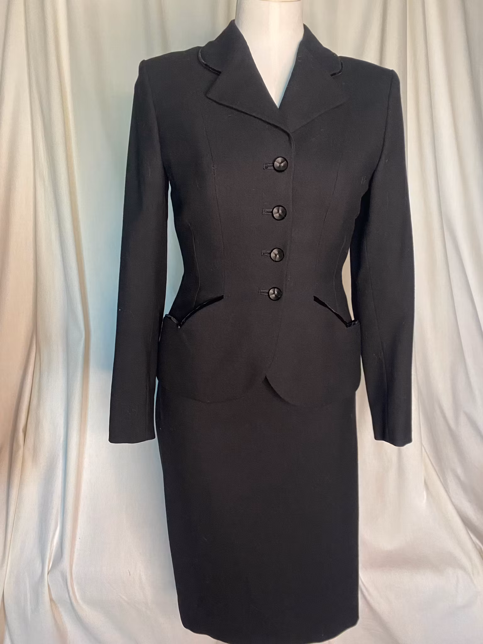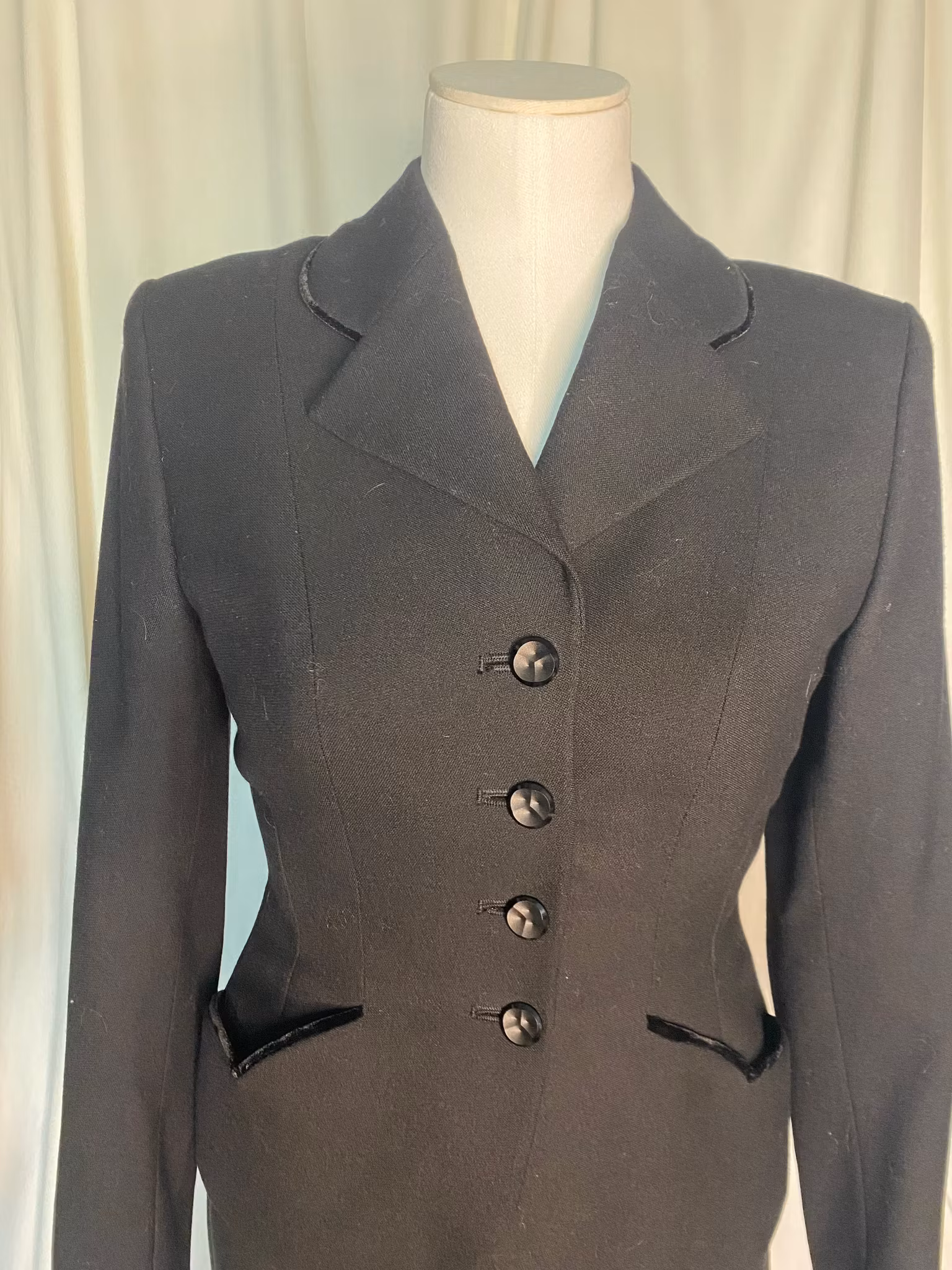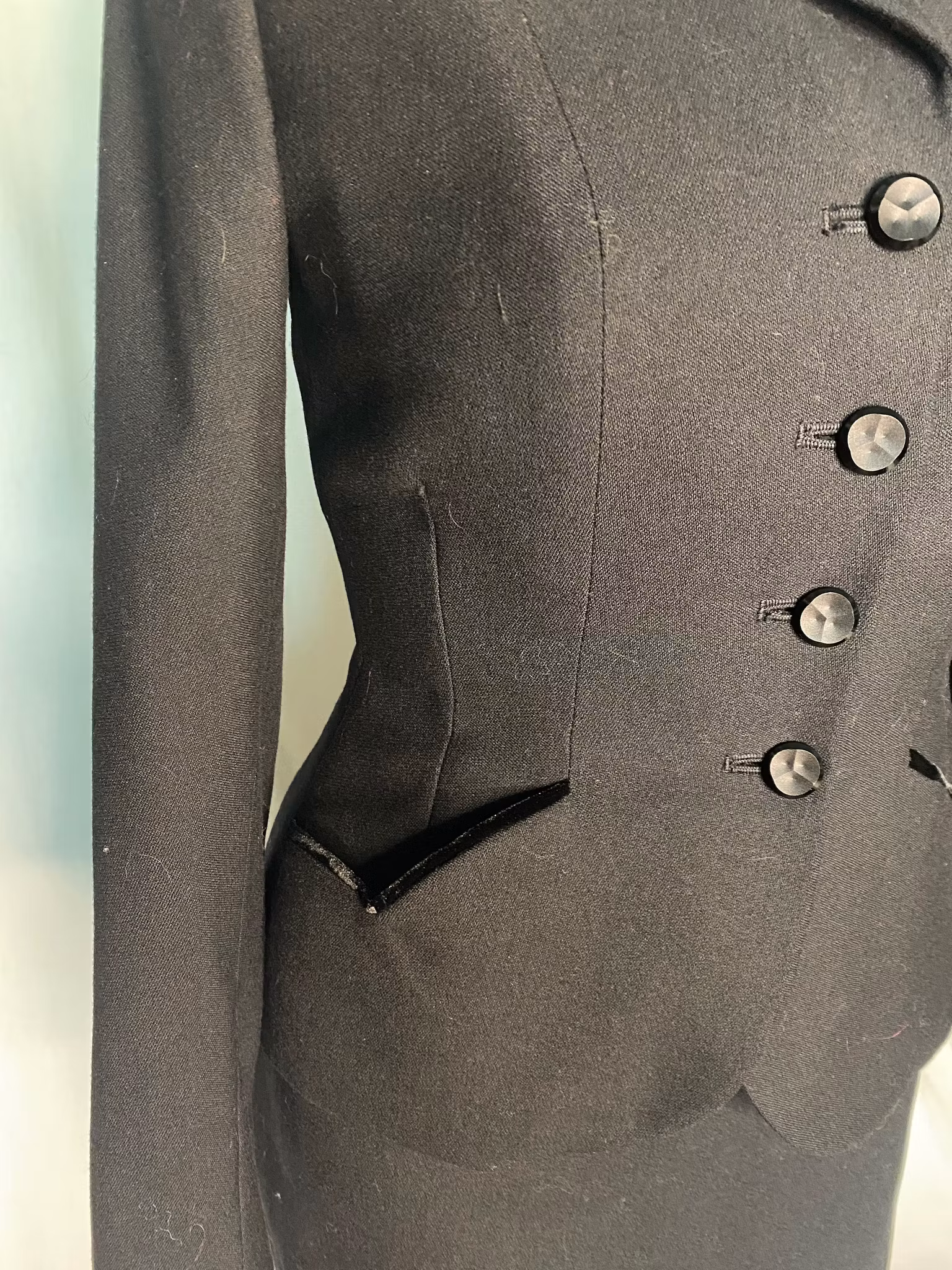 50-tals dräkt i ull med detaljer i sammet, dekorativa knappar, fin sick och kvalité