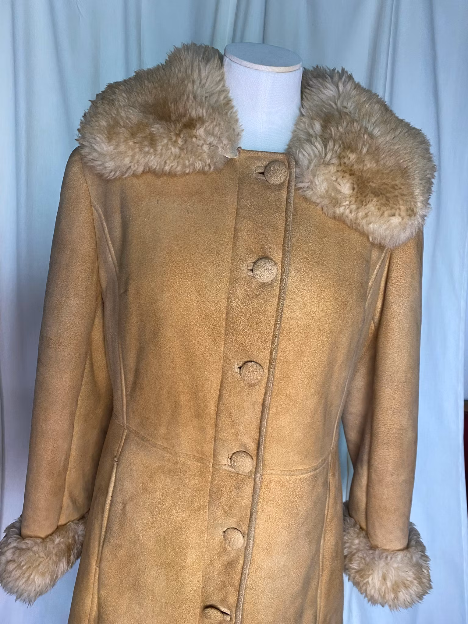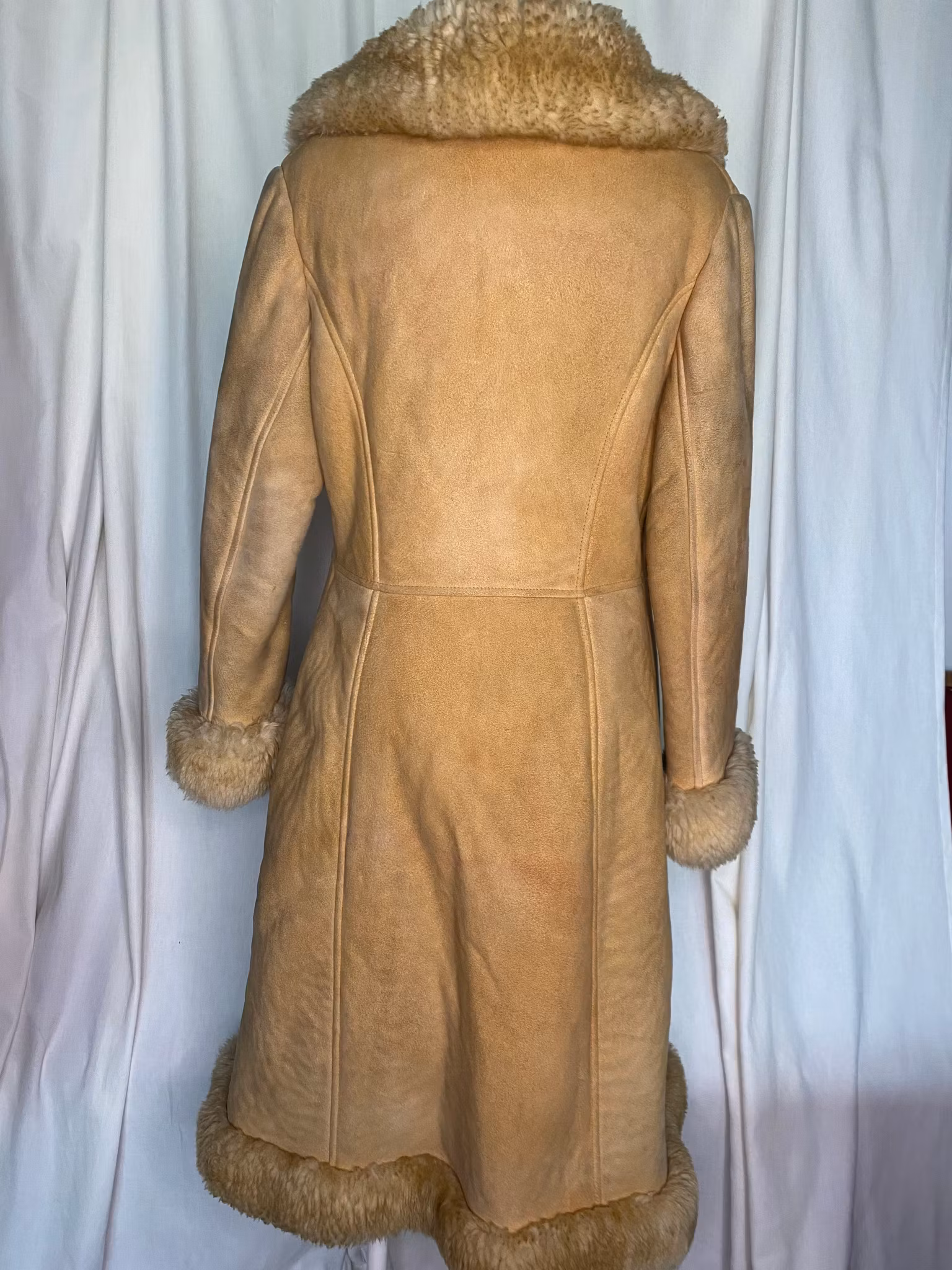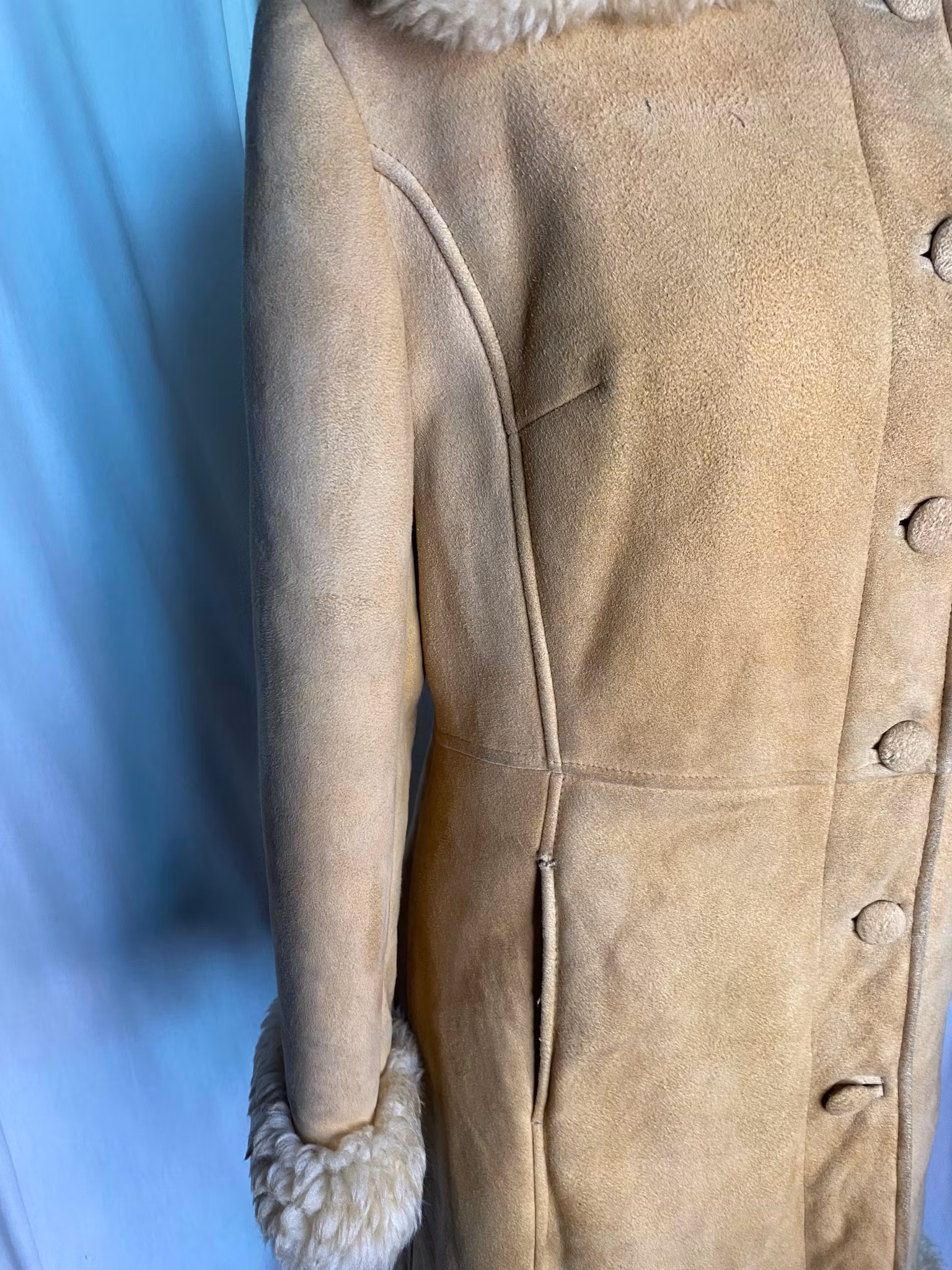 Vintage fårskinnkappa från 70-talet, markerat midja, fina detaljer, fin sick och kvalité ( liten slitage i mockadelar)