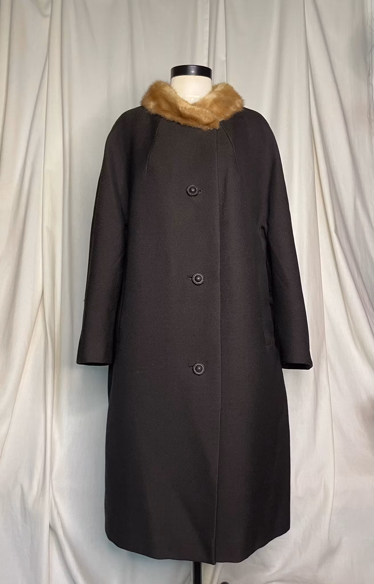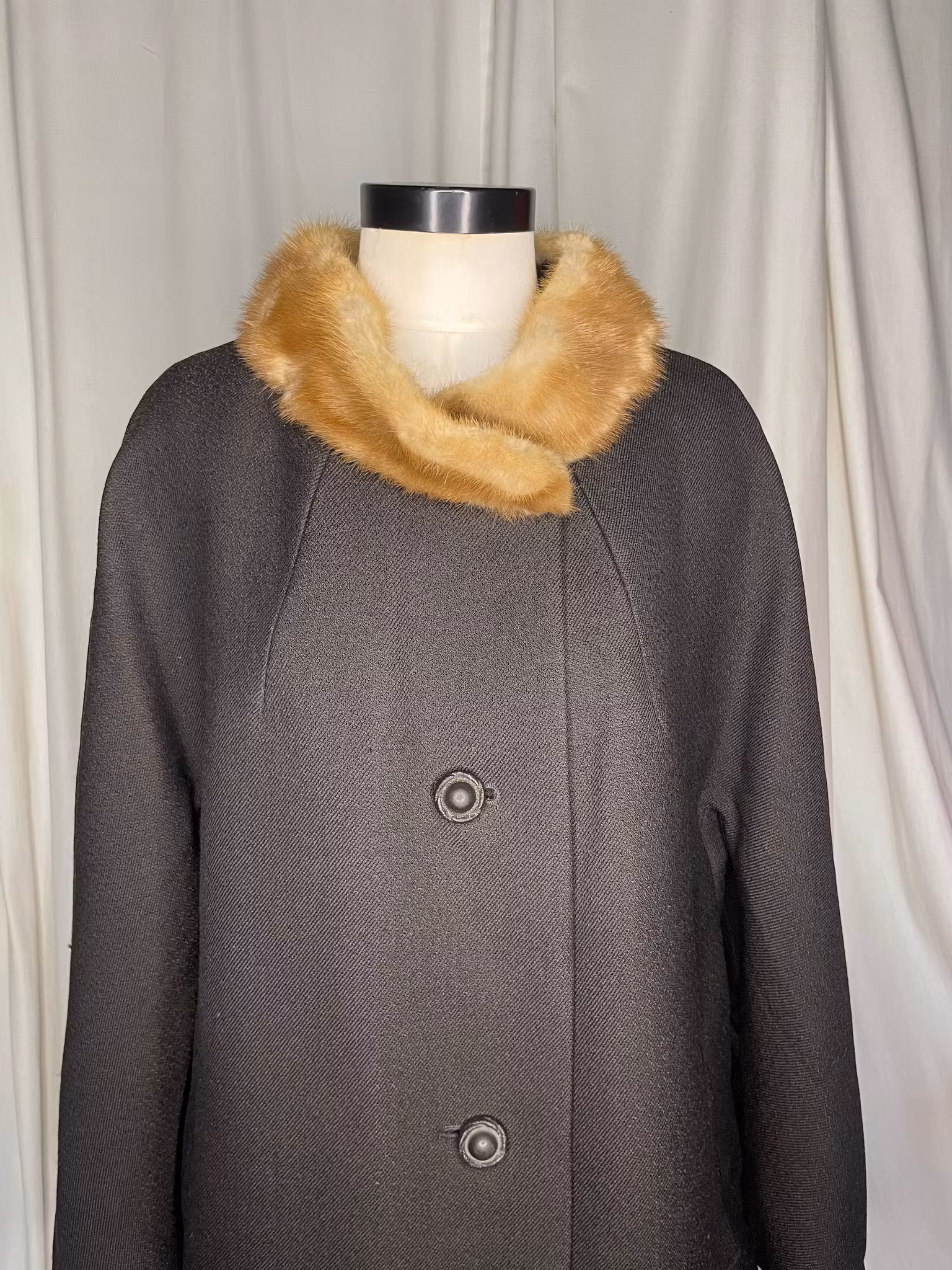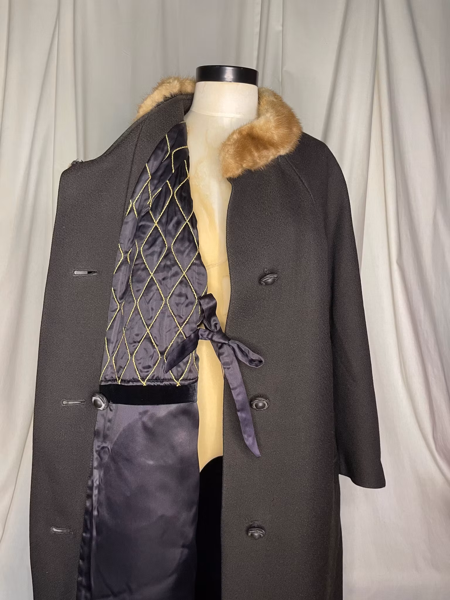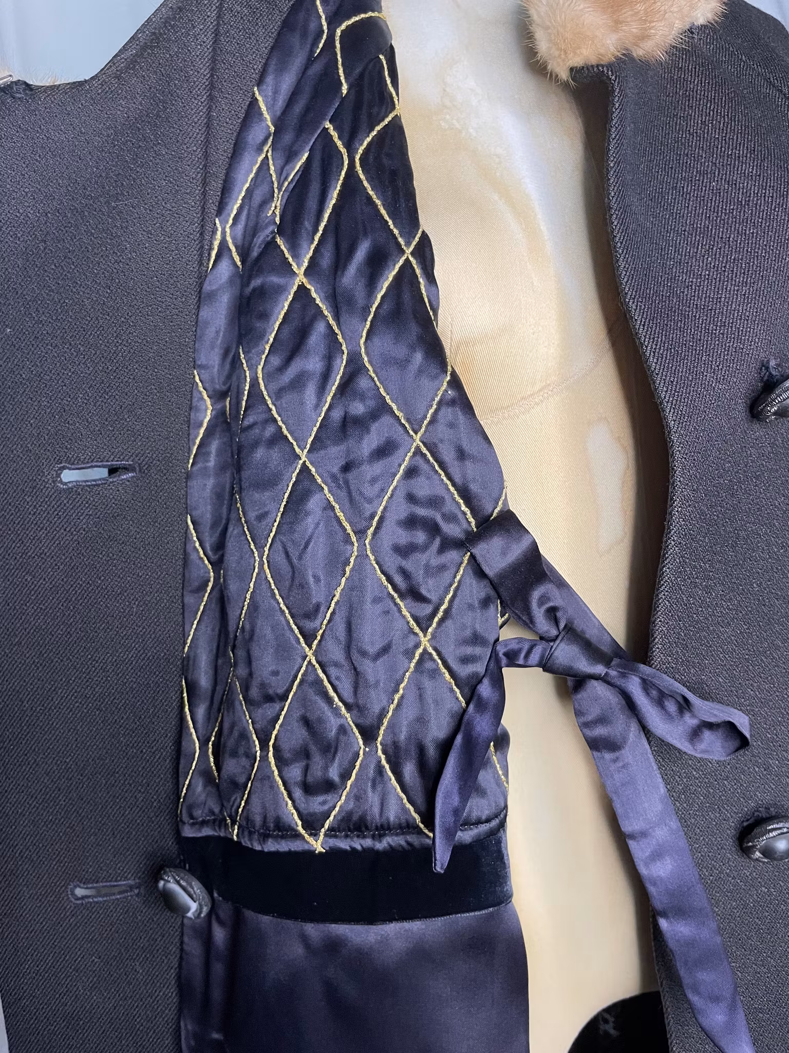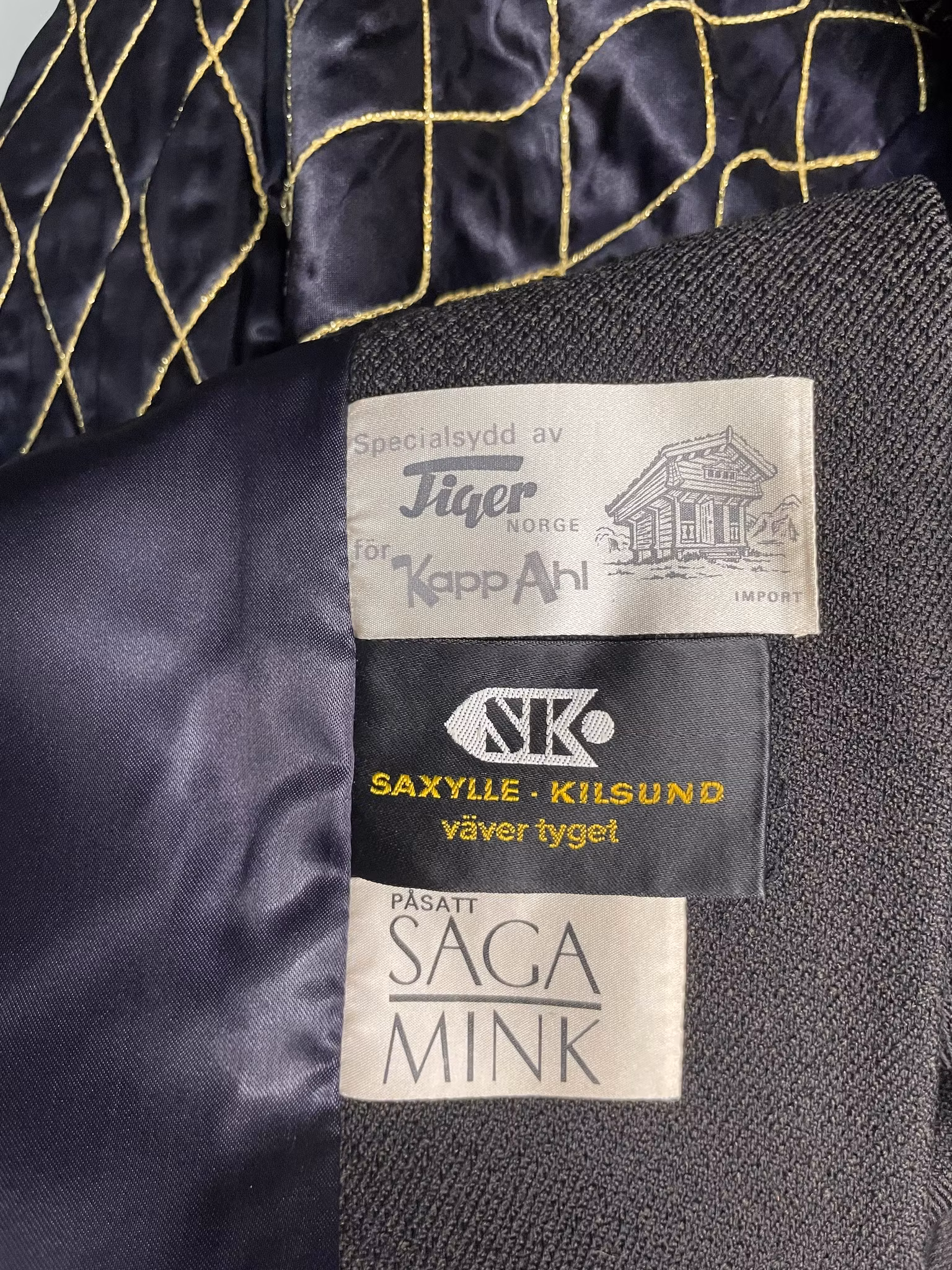 Vintage kappa med minkkrage. Innerfoder i satin med guldbroderi. Två fickor på framsidan. Fint skick och kvalité. Uppskattad storlek S/M.