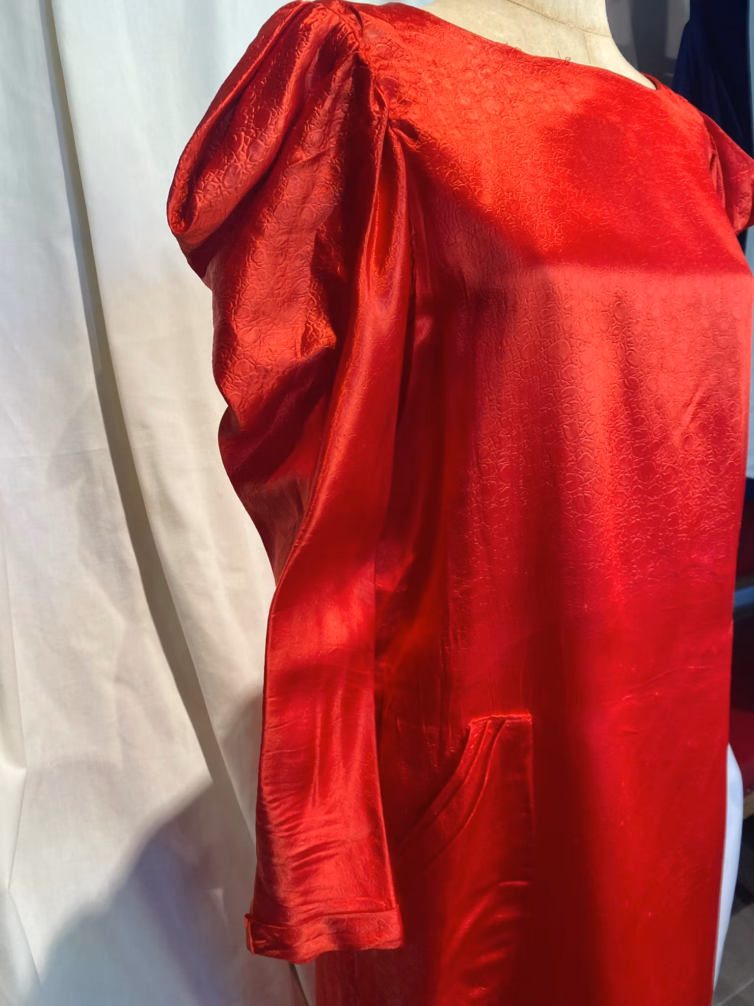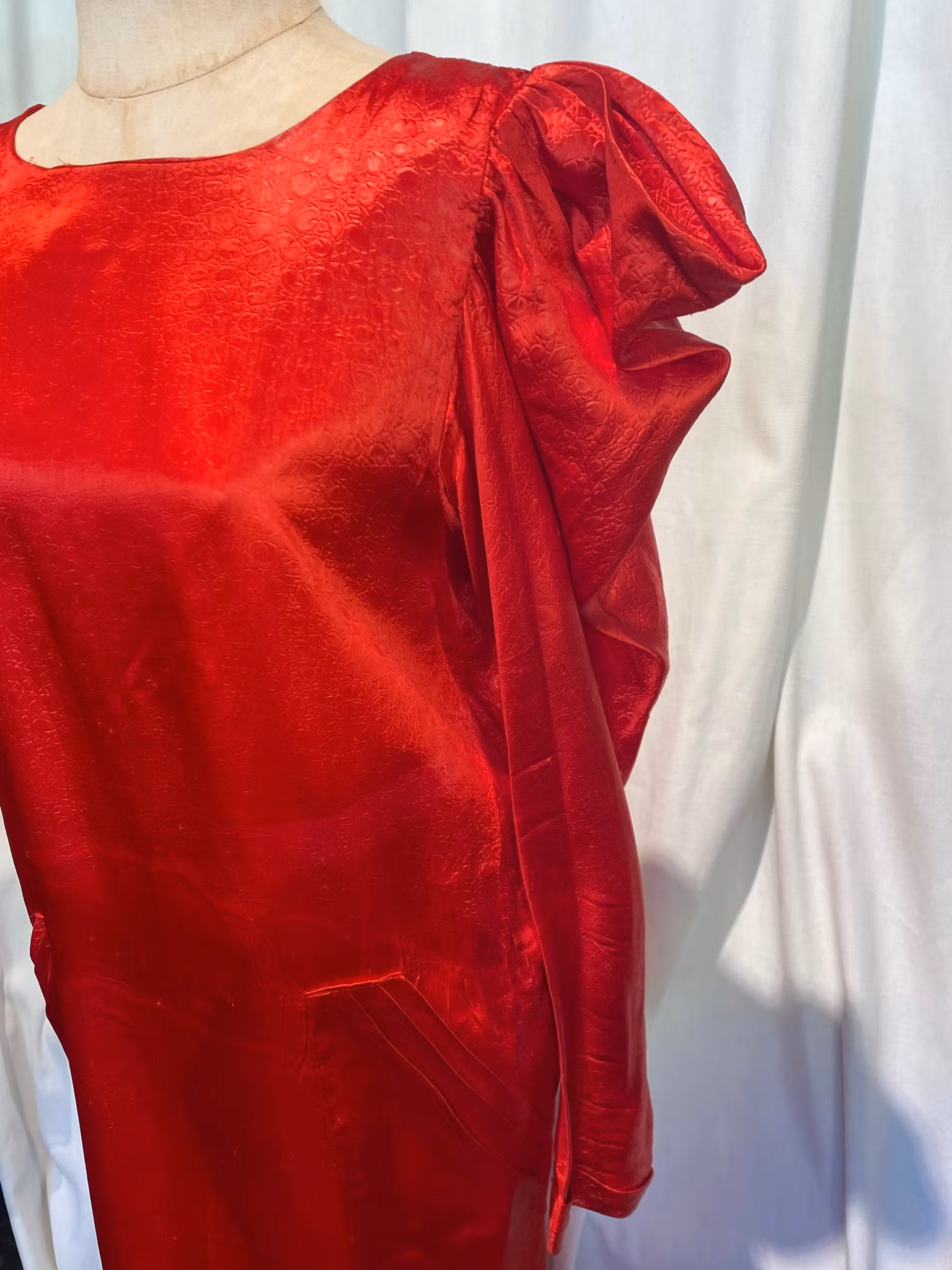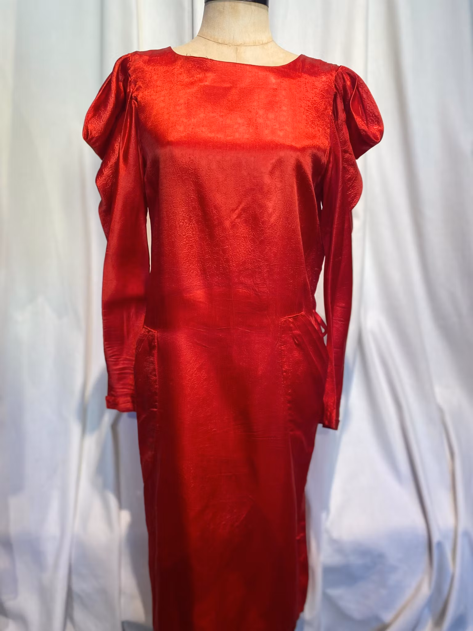 Röd vintage klänning, 80-talet i viskos, struktur i materialet (krokodil) dekorativa knappar i ryggen, fickor, puffärm, saknar skärp, fin sick , storlek M, producerat i Frankrike