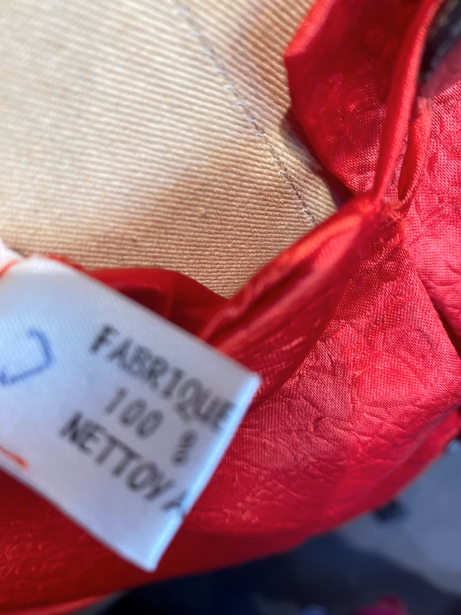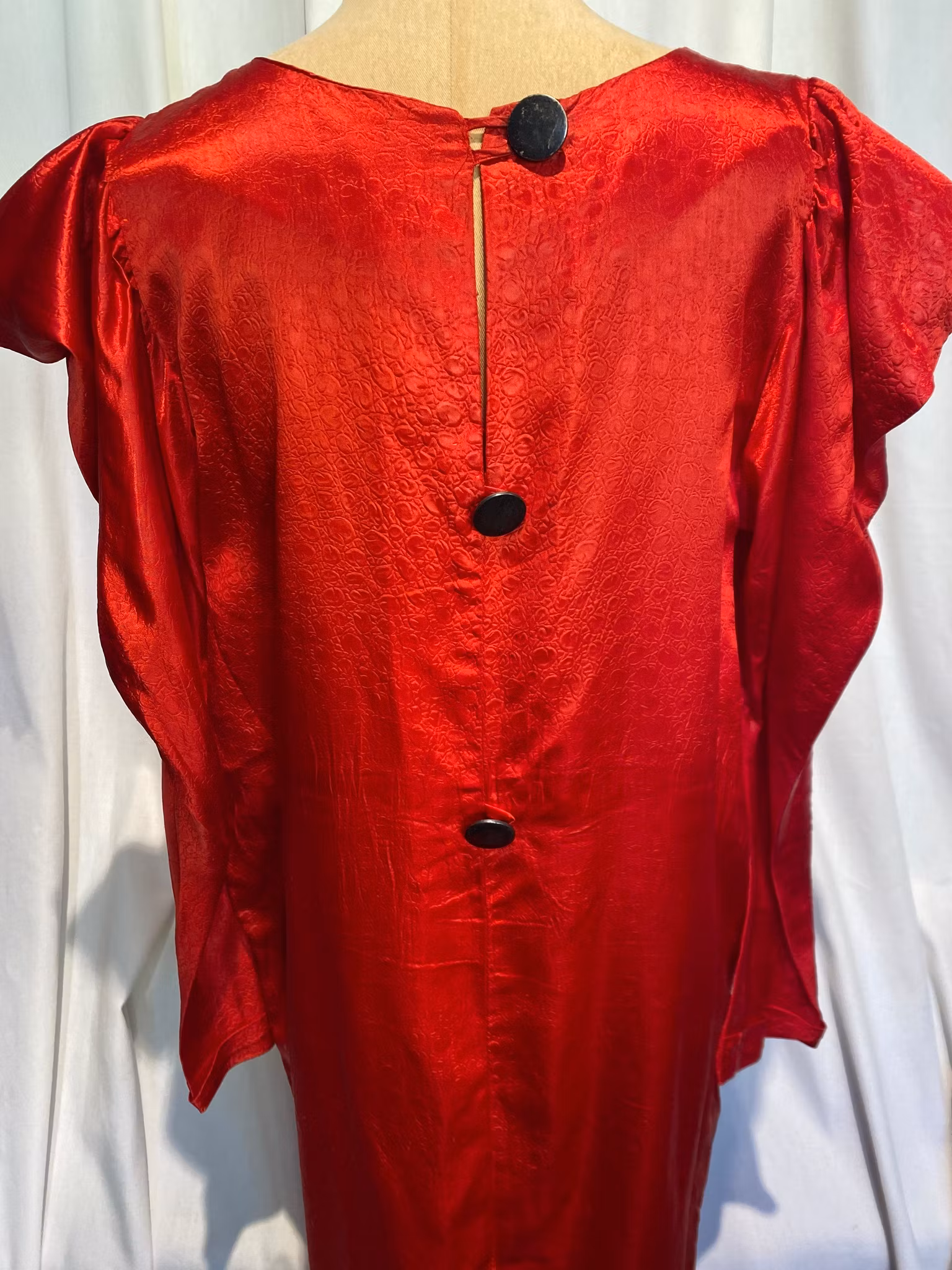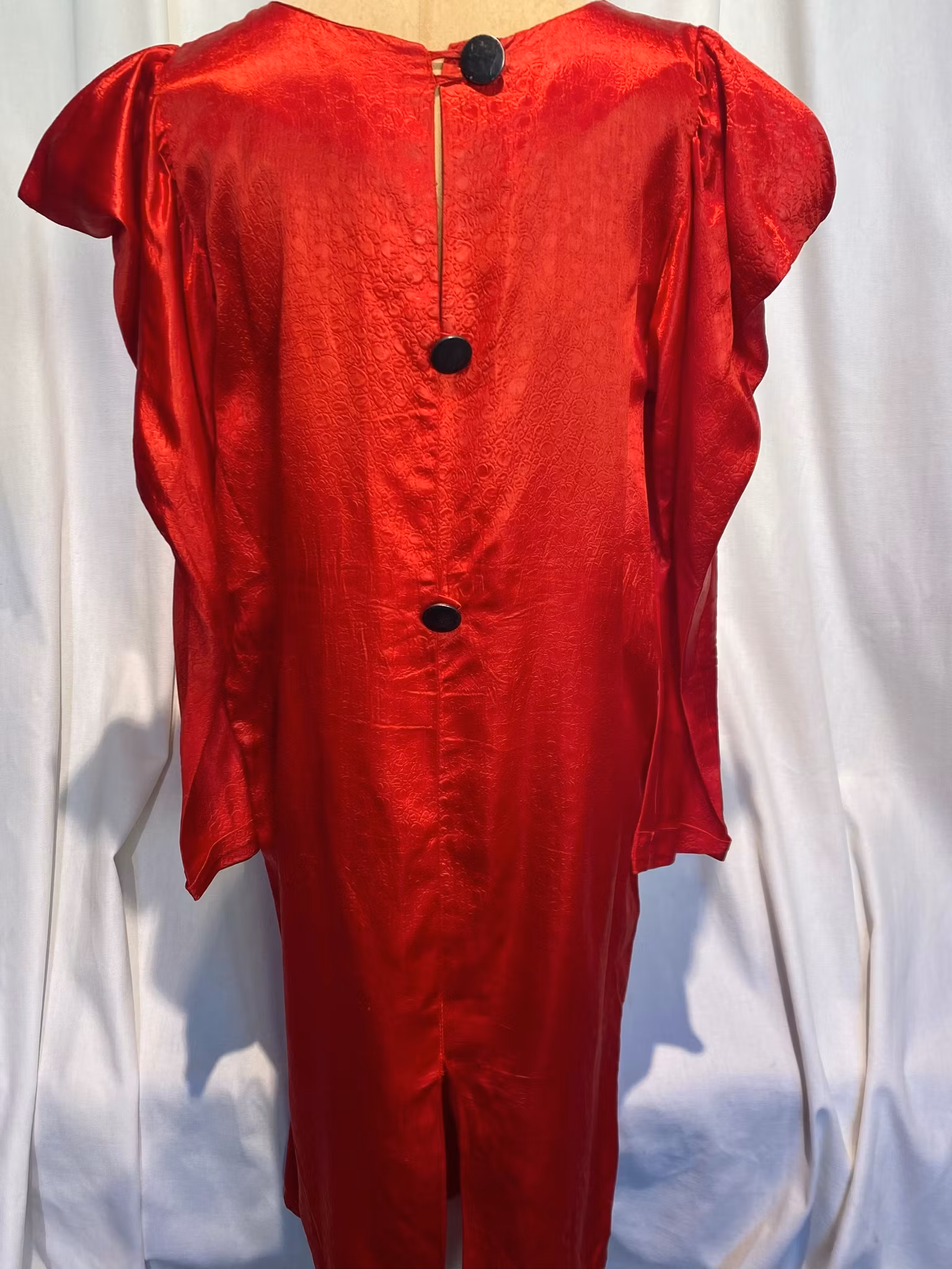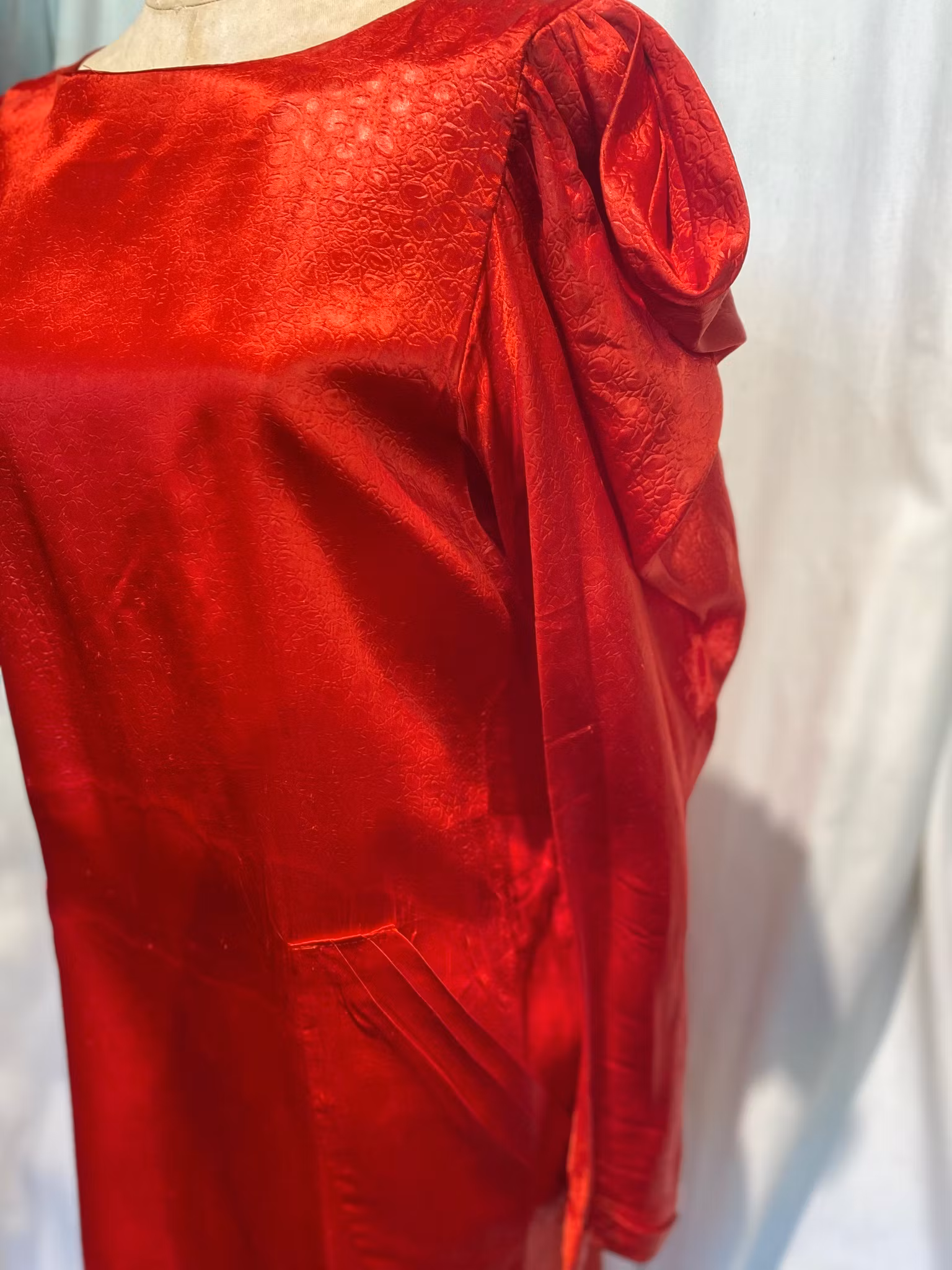 Röd vintage klänning, 80-talet i viskos, struktur i materialet (krokodil) dekorativa knappar i ryggen, fickor, puffärm, saknar skärp, fin sick , storlek M, producerat i Frankrike
