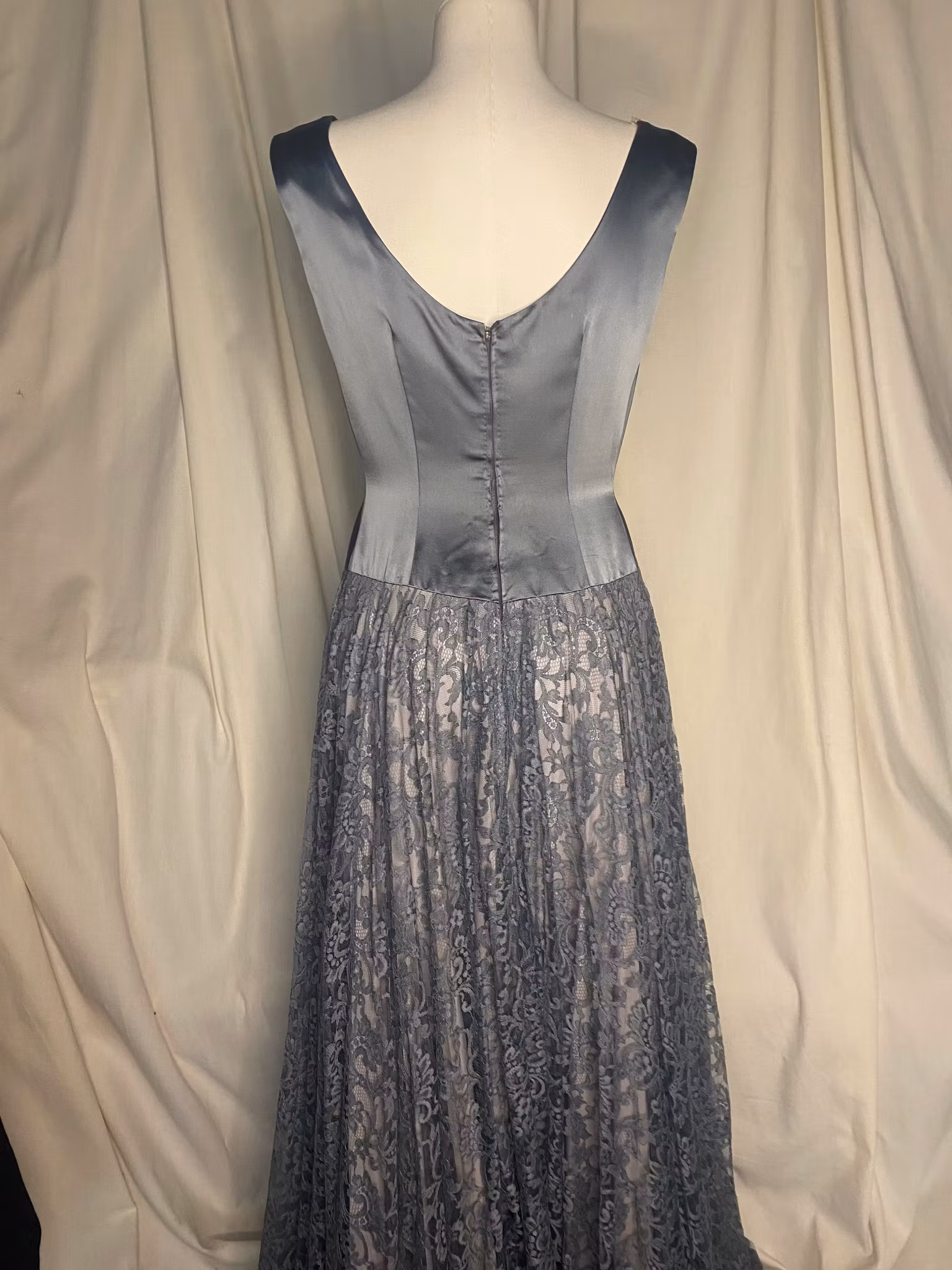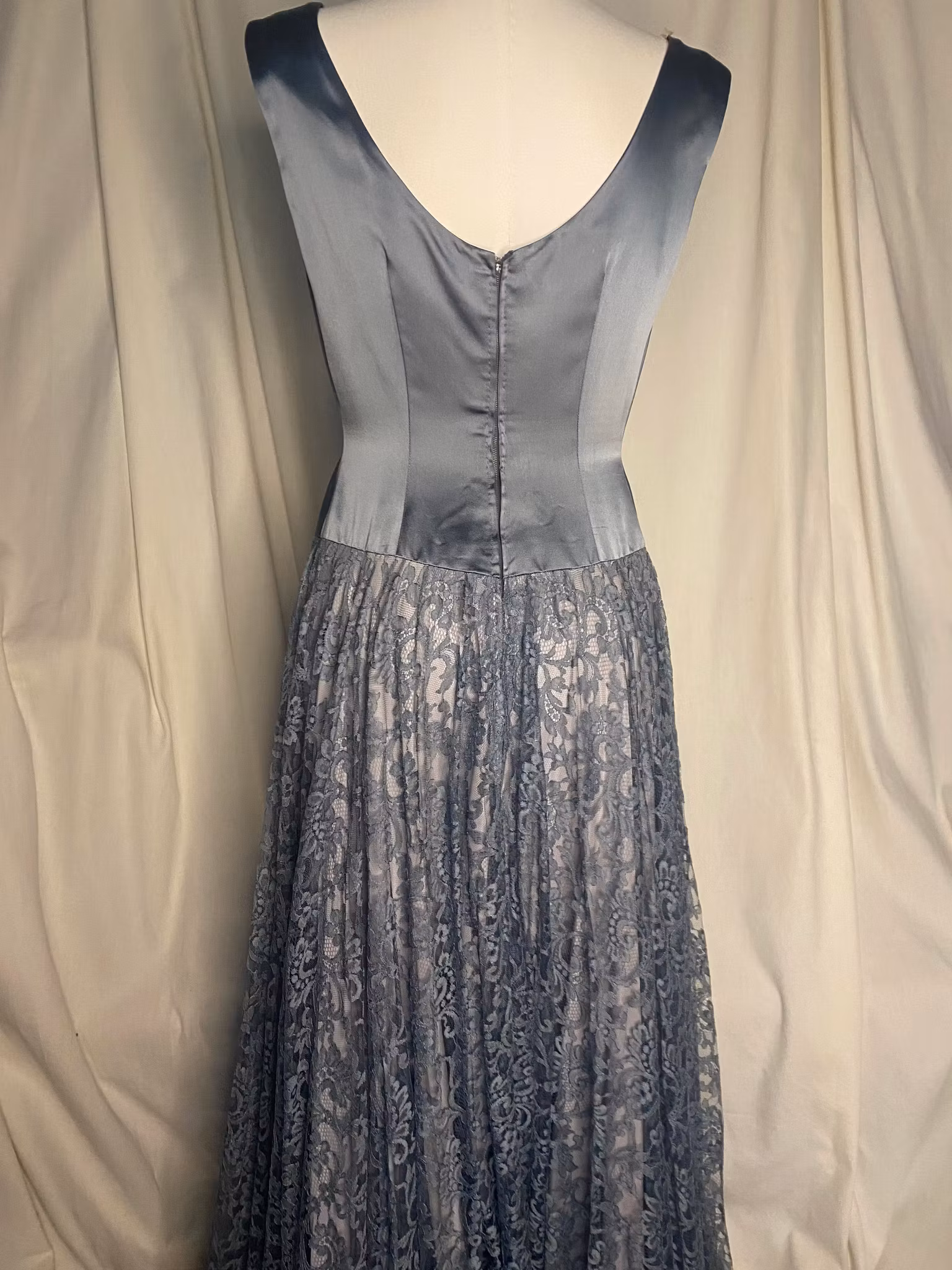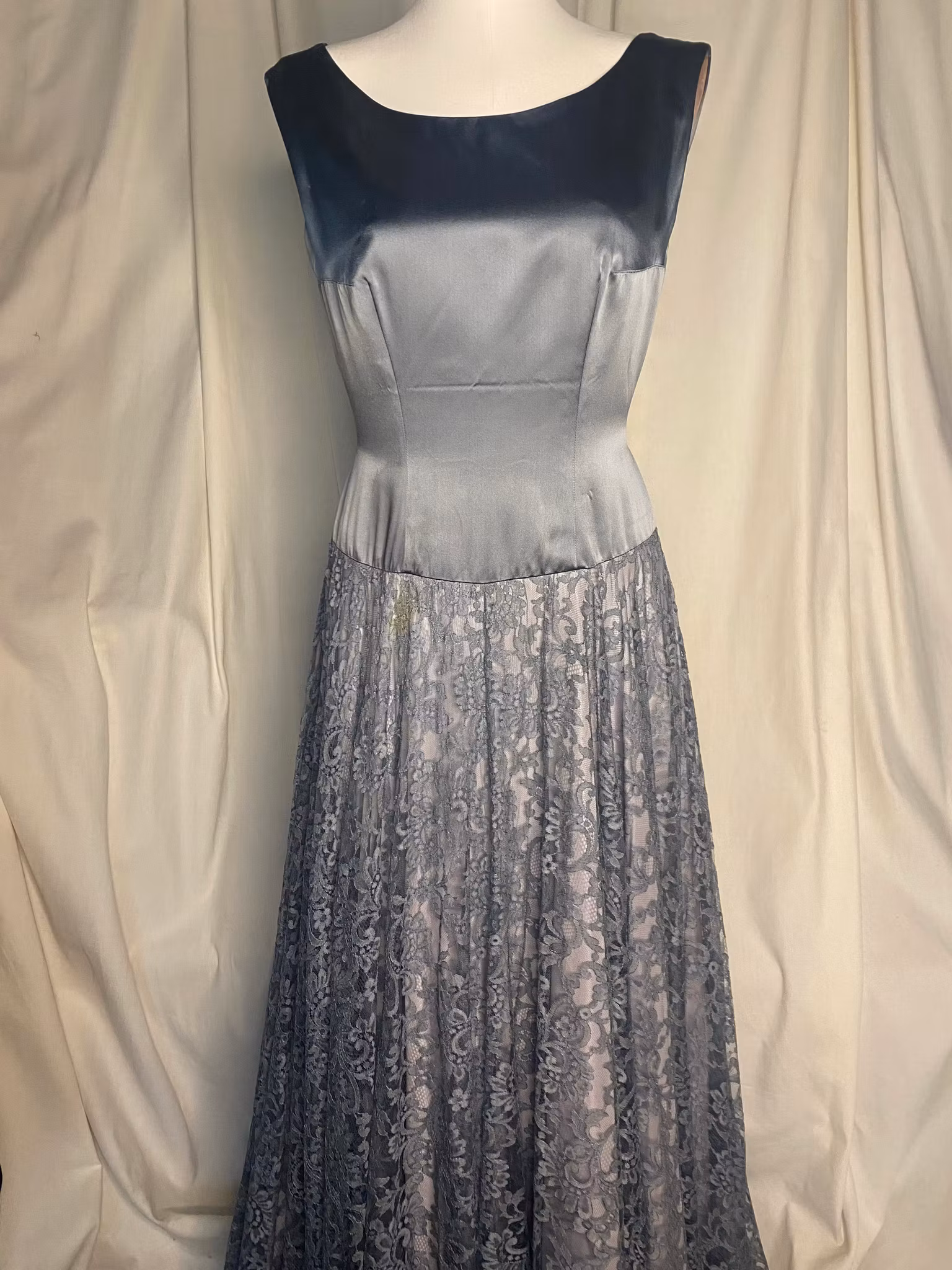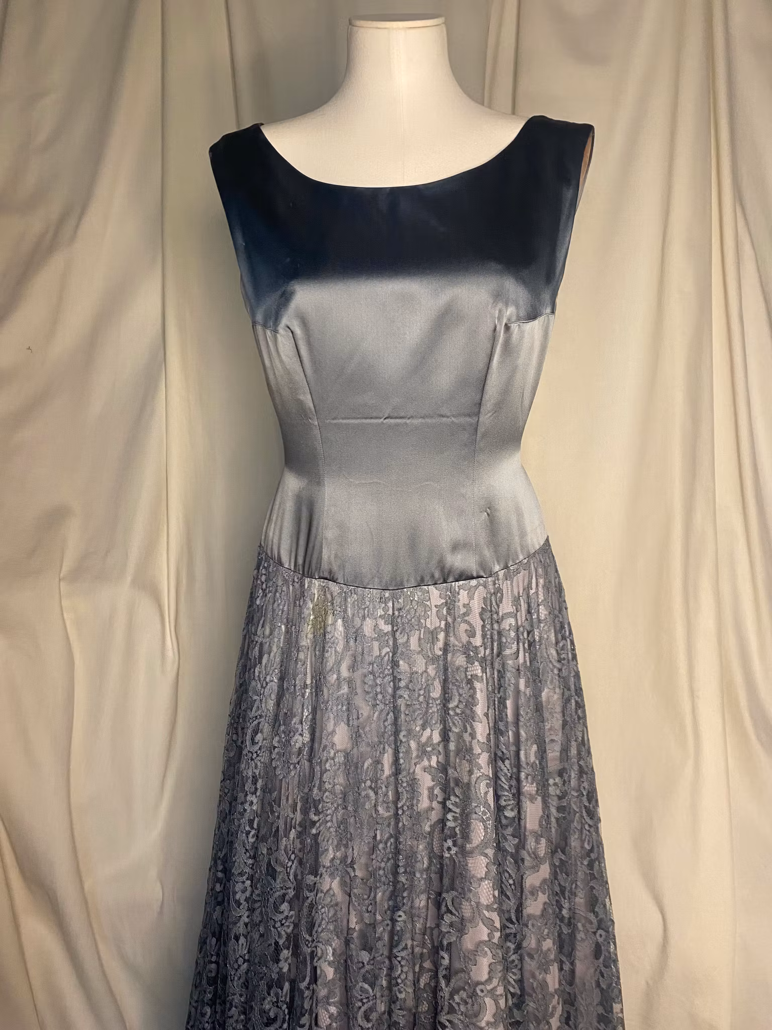 Vintage klänning från 40-takwt i satin/spets, anpassat underkjol, dragkedja i ryggen, en liten fläck i spetsen på framsidan, går att dölja, fin sick och kvalité