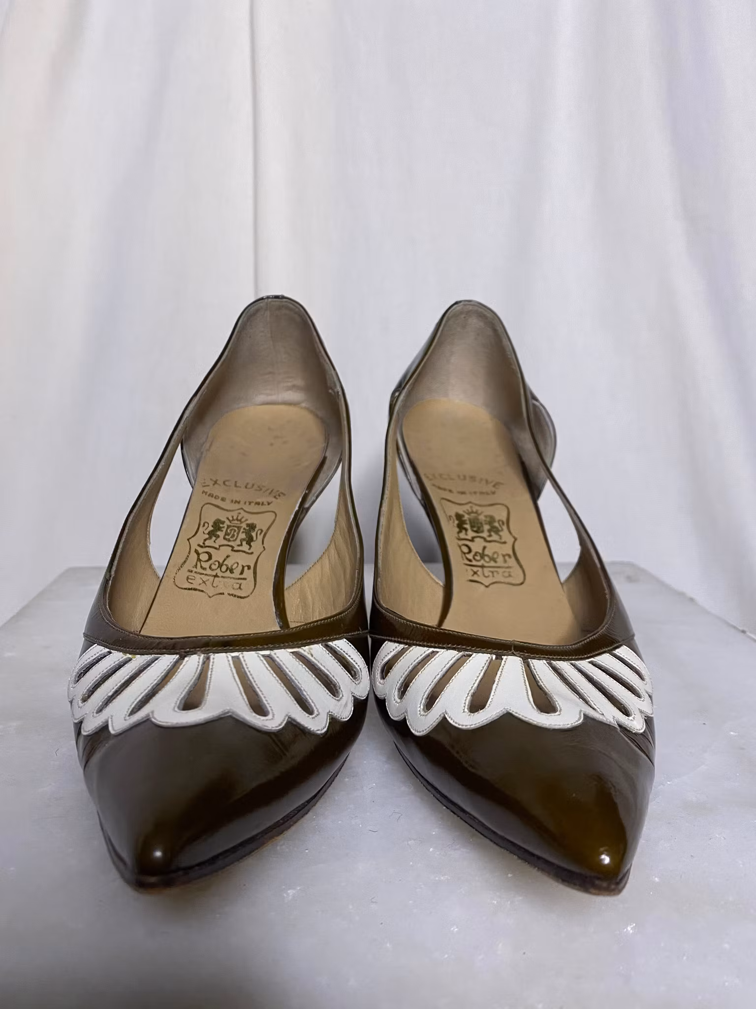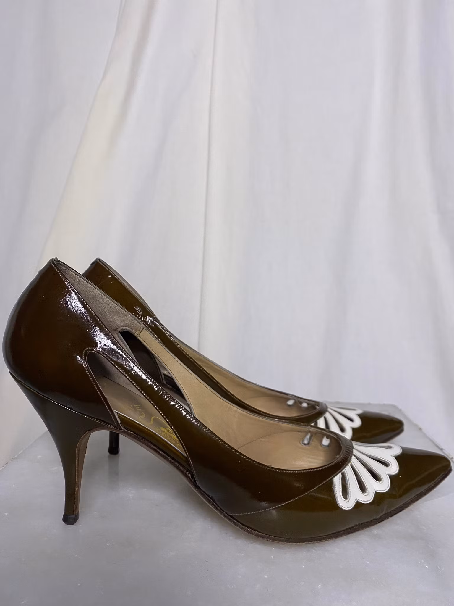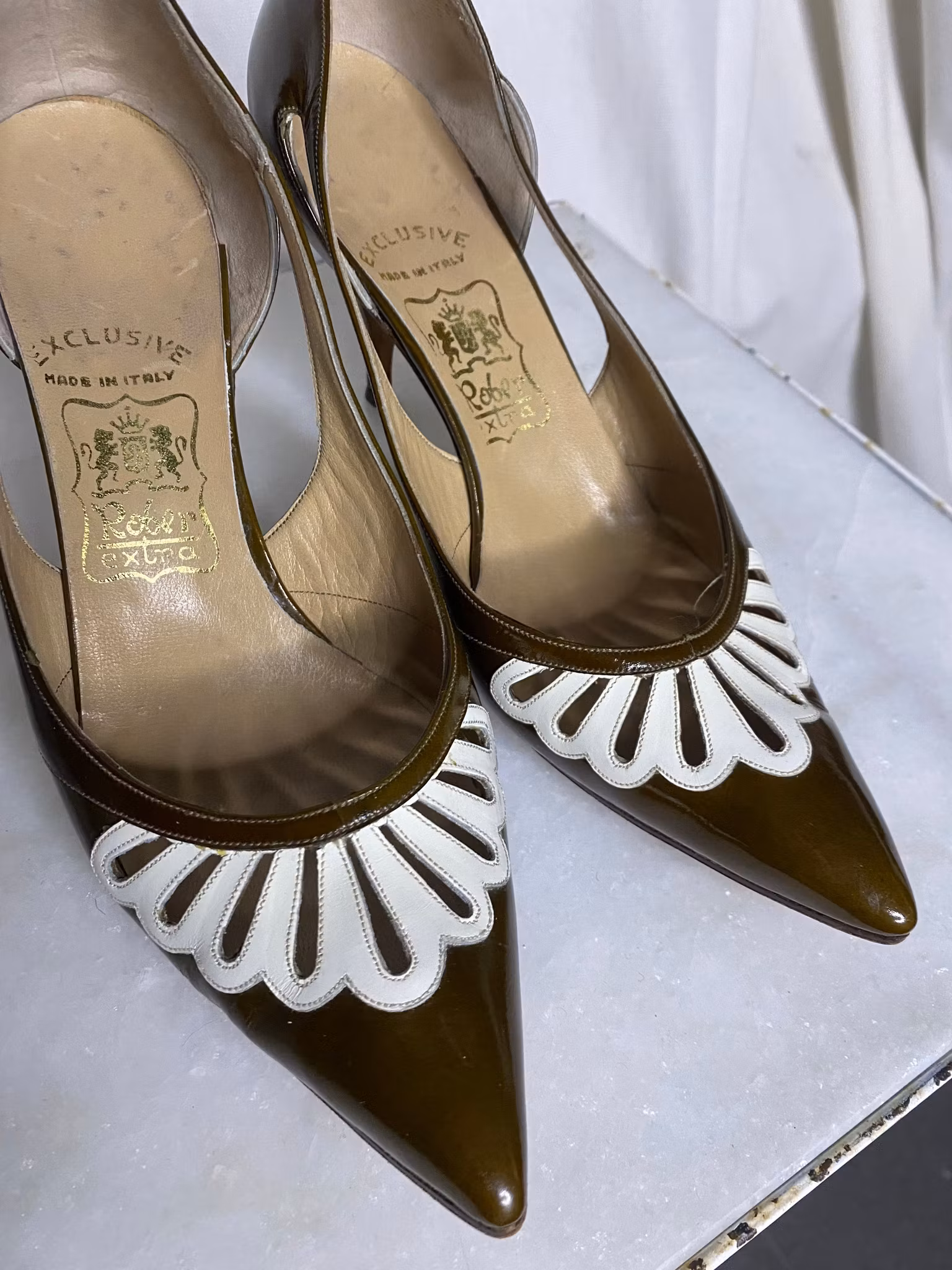Vintage skor i lackläder, fina detaljer i vit lack, storlek 36,5 klack höjd 8 cm